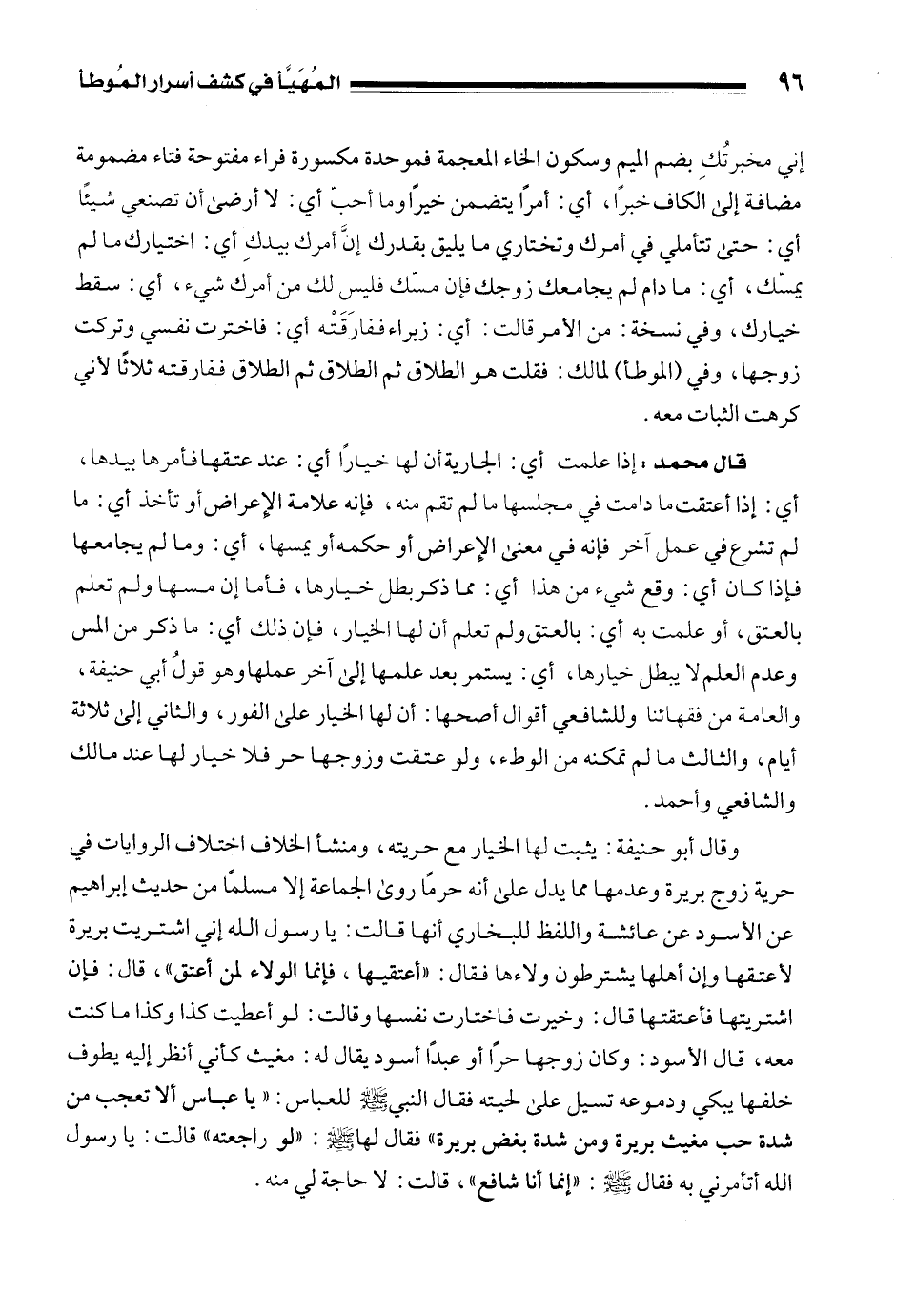 وقال أبو حنيفة: يثبت لها الخيار مع حريته، ومنشأ الخلاف اختلاف الروايات في حرية زوج بريرة وعدمها مما يدل على أنه حرمًا روى الجماعة إلا مسلمًا من حديث إبراهيم عن الأسود عن عائشة واللفظ للبخاري أنها قالت: يا رسول الله إني اشتريت بريرة لأعتقها وإن أهلها يشترطون ولاءها فقال: "أعتقيها، فإنما الولاء لمن أعتق"، قال: فإن اشتريتها فأعتقتها قال: وخيرت فاختارت نفسها وقالت: لو أعطيت كذا وكذا ما كنت معه، قال الأسود: وكان زوجها حرًا أو عبدًا أسود يقال له: مغيث كأني أنظر إليه يطوف خلفها يبكي ودموعه تسيل على لحيته فقال النبي - صلى الله عليه وسلم - للعباس: "يا عباس ألا تعجب من شدة حب مغيث بريرة ومن شدة بغض بريرة" فقال لها - صلى الله عليه وسلم -: "لو راجعته" قالت: يا رسول الله أتأمرني به فقال - صلى الله عليه وسلم -: "إنما أنا شافع"، قالت: لا حاجة لي منه.
