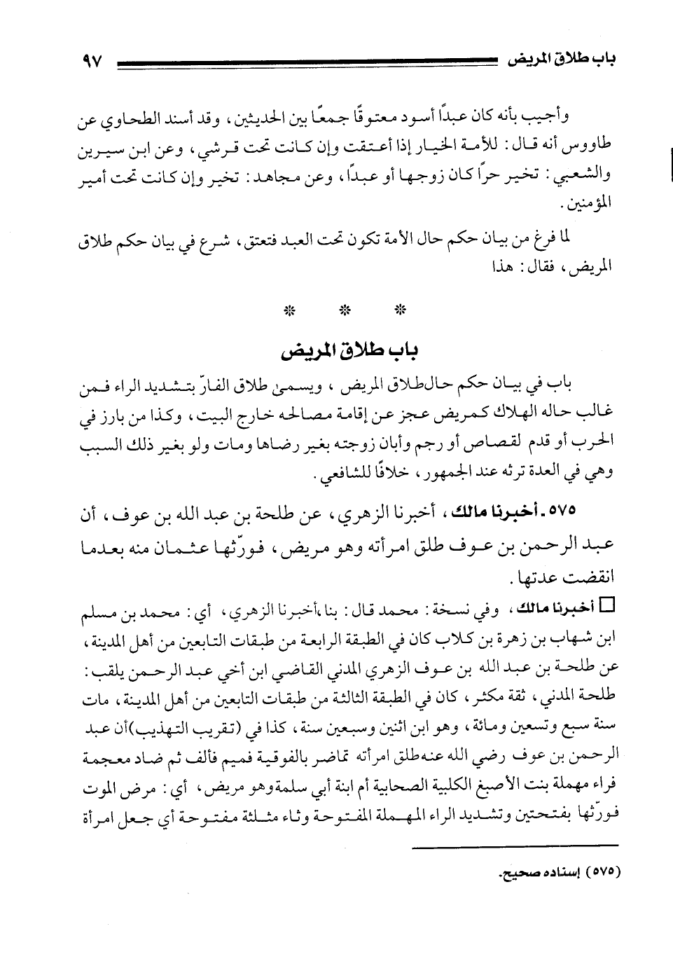 • أخبرنا مالك، وفي نسخة: محمد قال: بنا، أخبرنا الزهري، أي: محمد بن مسلم بن شهاب بن زهرة بن كلاب كان في الطبقة الرابعة من طبقات التابعين من أهل المدينة، عن طلحه بن عبد الله بن عوف الزهري المدني القاضي ابن أخي عبد الرحمن يلقب: طلحة المدني، ثقة مكثر، كان في الطبقة الثالثة من طبقات التابعين من أهل المدينة، مات سنة سبع وتسعين ومائة، وهو ابن اثنين وسبعين سنة، كذا في (تقريب التهذيب) أن عبد الرحمن بن عوف رضي الله عنه طلق امرأته تماضر بالفوقية فميم فألف ثم ضاد معجمة فراء مهملة بنت الأصبغ الكلبية الصحابية أم ابنة أبي سلمة وهو مريض، أي: مرض الموت فورّثها بفتحتين وتشديد الراء المهملة المفتوحة وثاء مثلثة مفتوحة أي جعل امرأة