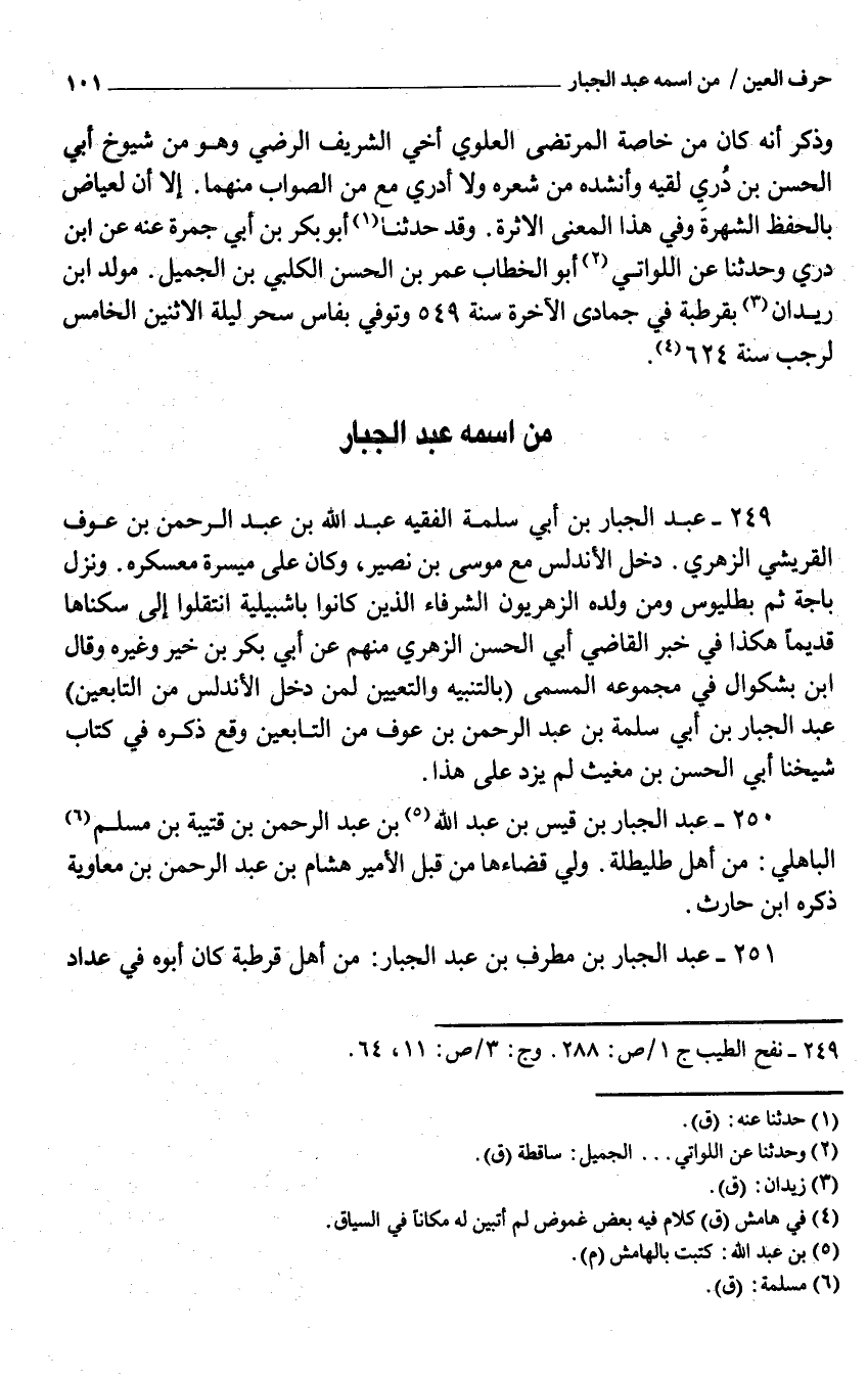 249 - عبد الْجَبَّار بن أَبِي سَلمَة الْفَقِيه عبد اللَّه بْن عَبْد الرَّحْمَن بْن عَوْف القريشي الزُّهْرِيّ دَخَلَ الأندلس مَعَ مُوسَى بن نصير وَكَانَ عَليّ ميسرَة مُعَسْكَره وَنزل باجة ثمَّ بطليوس وَمن وَلَده الزهريون الشرفاء الَّذين كَانُوا بإشبيلية انتقلوا إِلَى سكناهَا قَدِيما هَكَذَا فِي خبر القَاضِي أَبِي الْحسن الزُّهْرِيّ مِنْهُم عَن أَبِي بكر بن خير وَغَيره وَقَالَ ابْن بشكوال فِي مَجْمُوعه الْمُسَمّى بالتنبيه وَالتَّعْيِين لمن دَخَلَ الأندلس من التَّابِعين عبد الْجَبَّار بن أَبِي سَلمَة بْن عَبْد الرَّحْمَن بْن عَوْف من التَّابِعين وَقع ذكره فِي كتاب شَيخنَا أَبِي الْحسن بن مغيث لم يزدْ عَليّ هَذَا