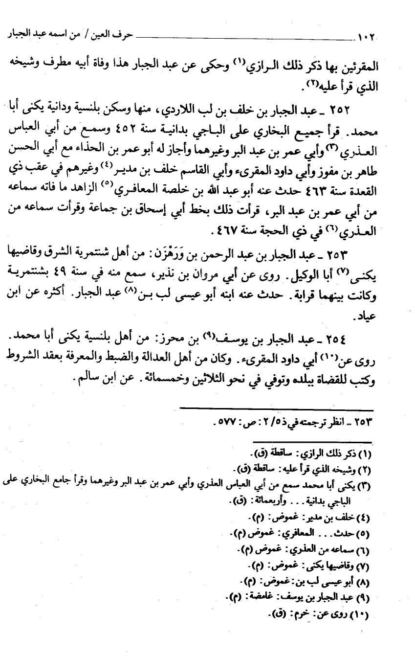 252 - عبد الْجَبَّار بن خلف بن لب اللاردي مِنْهَا وَسكن بلنسية ودانية يكنى أَبَا مُحَمَّد قَرَأَ جَمِيع الْبُخَارِي على الْبَاجِيّ بدانية سنة 452 وَسمع من أَبِي الْعَبَّاس العذري وَأبي عمر بن عبد الْبر وَغَيرهمَا وَأَجَازَ لَهُ أَبُو عُمَر بْن الْحذاء مَعَ أَبِي الْحسن طَاهِر بن مفوز وَأبي دَاوُد المقرىء وَأبي الْقَاسِم خلف بن مدير وَغَيرهم فِي عقب ذِي الْقعدَة سنة 463 حدث عَنهُ أَبُو عبد الله بن خلصة الْمعَافِرِي الزَّاهِد مَا فَاتَهُ سَمَاعه من أَبِي عمر بن عبد الْبر قَرَأت ذَلِك بِخَط أَبِي إِسْحَاق بن جمَاعَة وقرأت سَمَاعه من العذري فِي ذِي الْحجَّة سنة 467