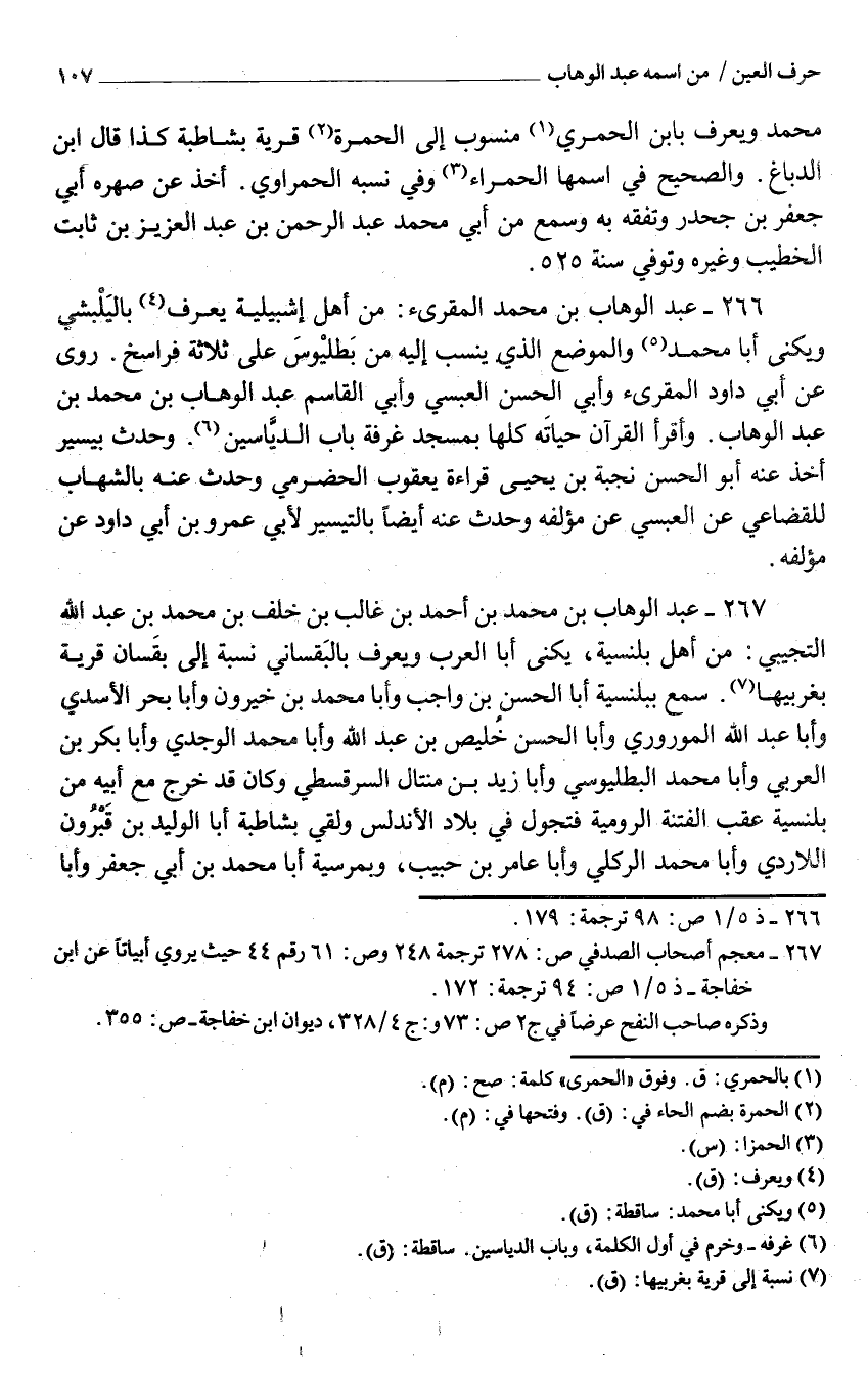 266 - عبد الْوَهَّاب بن مُحَمَّد المقرىء من أهل إشبيلية يعرف باليلبشي ويكنى أَبَا مُحَمَّد والموضع الَّذِي ينْسب إِلَيْهِ من بطليوس عَليّ ثَلَاثَة فراسخ روى عَن أَبِي دَاوُد المقرىء وَأبي الْحسن الْعَبْسِي وأبى الْقَاسِم عَبْد الْوَهَّاب بْن مُحَمَّد بْن عبد الْوَهَّاب وأقرأ الْقُرْآن حَيَاته كلهَا بِمَسْجِد غرفَة بَاب الدياسين وَحدث بِيَسِير أَخذ عَنْهُ أَبُو الْحَسَن نجبة بن يحيى قِرَاءَة يَعْقُوب الْحَضْرَمِيّ وَحدث عَنهُ بالشهاب للقضاعي عَن الْعَبْسِي عَن مُؤَلفه وَحدث عَنهُ أَيْضا بالتيسير لأبي عَمْرو بن أَبِي دَاوُد عَن مُؤَلفه