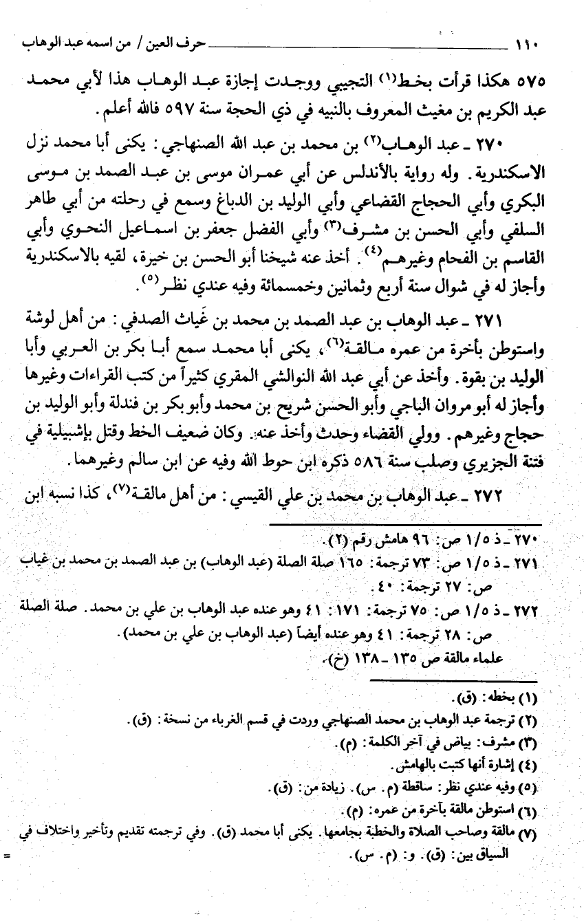 270 - عبد الْوَهَّاب بْن مُحَمَّد بْن عَبْد اللَّه الصنهاجي يكنى أَبَا مُحَمَّد نزل الْإسْكَنْدَريَّة وَله رِوَايَة بالأندلس عَن أَبِي عمرَان مُوسَى بن عبد الصَّمد بن مُوسَى الْبكْرِيّ وَأبي الْحجَّاج الْقُضَاعِي وَأبي الْوَلِيد بن الدّباغ وَسمع فِي رحلته من أَبِي طَاهِر السلَفِي وَأبي الْحسن بن مشرف وَأبي الْفضل جَعْفَر بن إِسْمَاعِيل النَّحْوِيّ وَأبي الْقَاسِم بن الفحام وَغَيرهم أَخذ عَنهُ شَيخنَا أَبُو الْحسن بن خيرة لقِيه بالإسكندرية وَأَجَازَ لَهُ فِي شَوَّال سنة أَربع وَثَمَانِينَ وَخَمْسمِائة وَفِيه عِنْدِي نظر