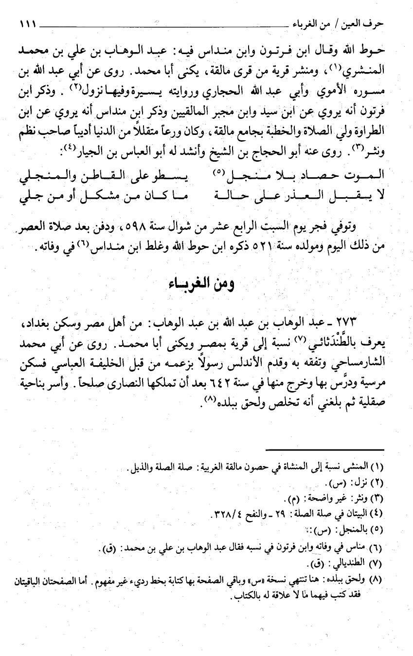 حوط الله وَقَالَ ابْن فرتون وَابْن منداس فِيهِ عبد الْوَهَّاب بن عَليّ بن مُحَمَّد المنشري ومنشر قَرْيَة من قري مالقة يكنى أَبَا مُحَمَّد روى عَنْ أَبِي عبد الله بن مسوره الْأمَوِي وَأبي عبد الله الحجاري وَرِوَايَته يسيرَة وفيهَا نزُول وَذكر ابْن فرتون أَنه يروي عَن ابْن سيد وَابْن مجبر المالقيين وَذكر ابْن منداس أَنه يروي عَن ابْن الطراوة ولي الصَّلَاة وَالْخطْبَة بِجَامِع مالقة وَكَانَ ورعا متقللا من الدُّنْيَا أديبا صَاحب نظم ونثر رُوِيَ عَنهُ أَبُو الْحجَّاج بن الشَّيْخ وَأنْشد لَهُ أَبُو الْعَبَّاس بن الجيار