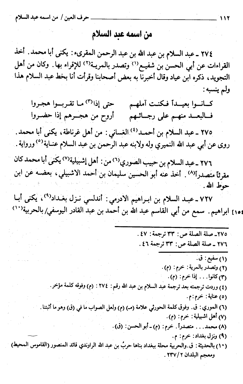 274 - عبد السَّلَام بن عبد الله بن عبد الرَّحْمَن المقرىء يكنى أَبَا مُحَمَّد أَخذ الْقرَاءَات عَنْ أبي الْحَسَن بْن شَفِيع وتصدر بالمرية للإقراء بهَا وَكَانَ من أهل التجويد ذكره ابْن عياد وَقَالَ أخبرنَا بِهِ بعض أَصْحَابنا وقرأت أَنا بِخَط عبد السَّلَام هَذَا وَلم ينْسبهُ
