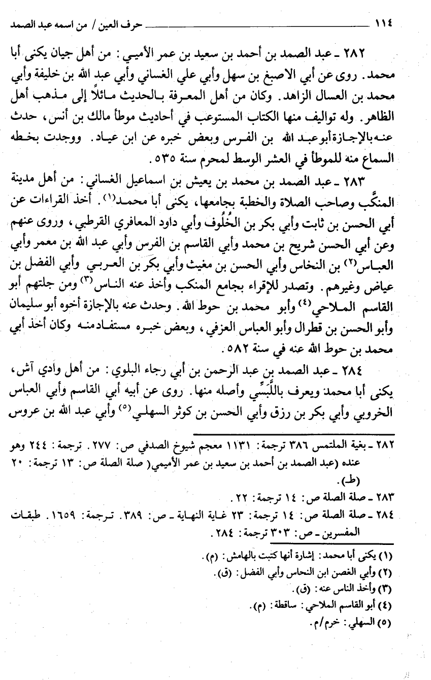282 - عبد الصَّمد بن أَحْمد بن سعيد بن عمر الأميي من أَهْلَ جيان يكنى أَبَا مُحَمَّد روى عنْ أَبِي الْأَصْبَغ بْن سهل وَأبي عَلِيّ الغساني وَأبي عَبْد اللَّه بْن خَليفَة وَأبي مُحَمَّد بن الْعَسَّال الزَّاهِد وَكَانَ من أهل الْمعرفَة بِالْحَدِيثِ مائلا إِلَى مَذْهَب أهل الظَّاهِر وَله تواليف مِنْهَا الْكتاب الْمُسْتَوْعب فِي أَحَادِيث موطأ مَالك بن أنس حدث عَنهُ بِالْإِجَازَةِ أَبُو عبد الله بن الْفرس وَبَعض خَبره عَن ابْن عياد وَوجدت بِخَطِّهِ السماع مِنْهُ للموطأ فِي الْعشْر الْوسط لمحرم سنة 535