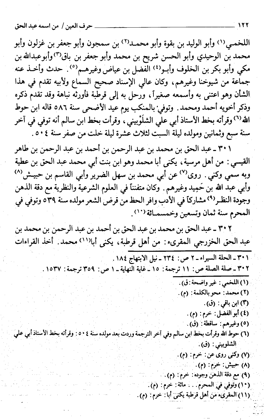 301 - عبد الْحق بن مُحَمَّد بْن عَبْد الرَّحْمَن بْن أَحْمَد بن عبد الرَّحْمَن بن طَاهِر القَيْسيّ من أَهْلَ مرسية يكنى أَبَا مُحَمَّد وَهُوَ ابْن بنت أبي مُحَمَّد عَبْد الْحق بْن عَطِيَّة وَبِه سمى وكني روى عَنْ أبي مُحَمَّد بْن سهل الضَّرِير وَأبي الْقَاسِم بن حُبَيْش وَأبي عَبْد اللَّه بْن حُمَيْد وَغَيرهم وَكَانَ متفننا فِي الْعُلُوم الشَّرْعِيَّة والنظرية مَعَ دقة الذِّهْن وجودة النّظر مشاركا فِي الْأَدَب وافر الْحَظ من قرض الشّعْر مولده سنة 539 وَتوفى فِي الْمحرم سنة ثَمَان وَتِسْعين وَخَمْسمِائة
