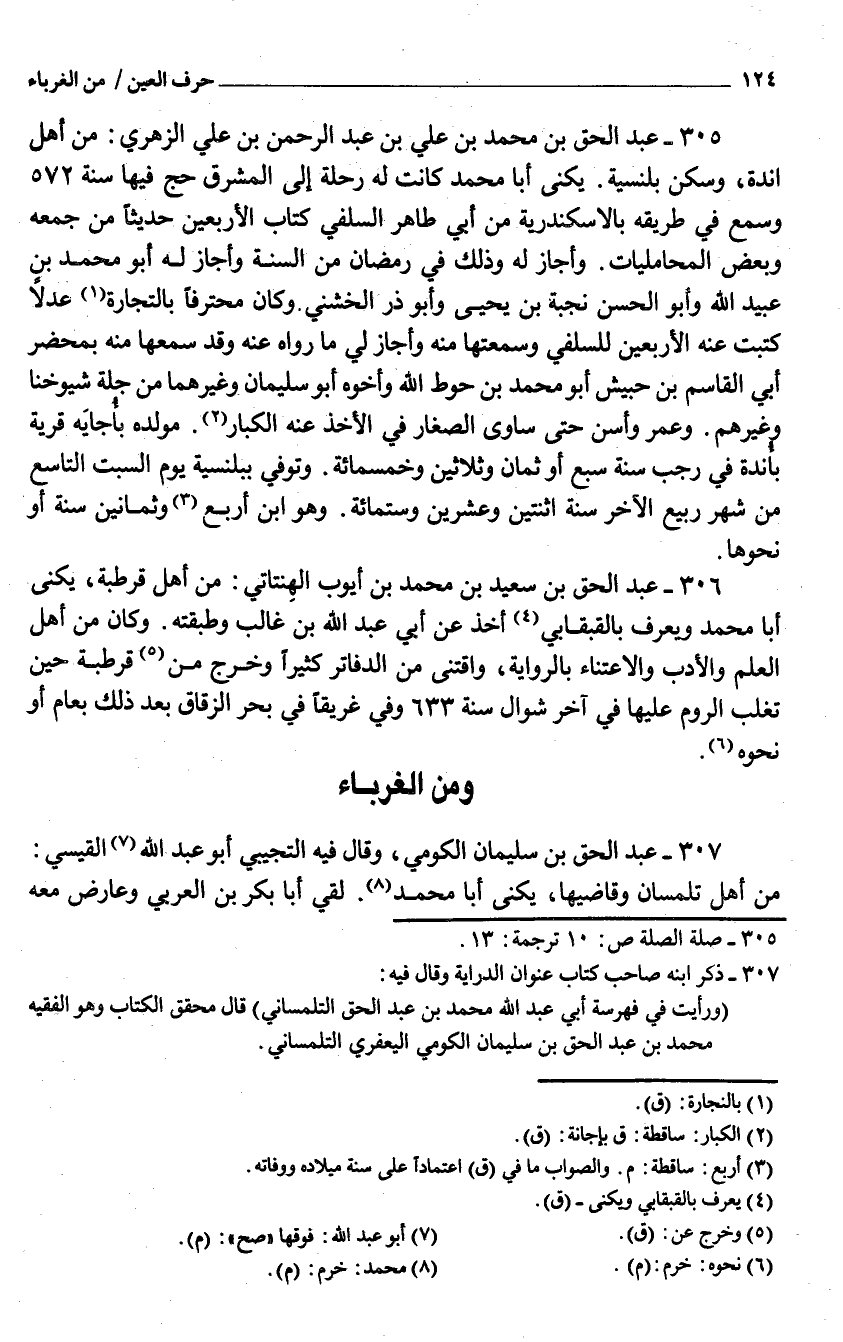 307 - عبد الْحق بن سُلَيْمَان الكومي وَقَالَ فِيهِ التجِيبِي أَبُو عبد الله الْقَيْسِي من أهل تلمسان وقاضيها يكنى أَبَا مُحَمَّد لَقِي أَبَا بكر بن الْعَرَبِيّ وعارض مَعَه