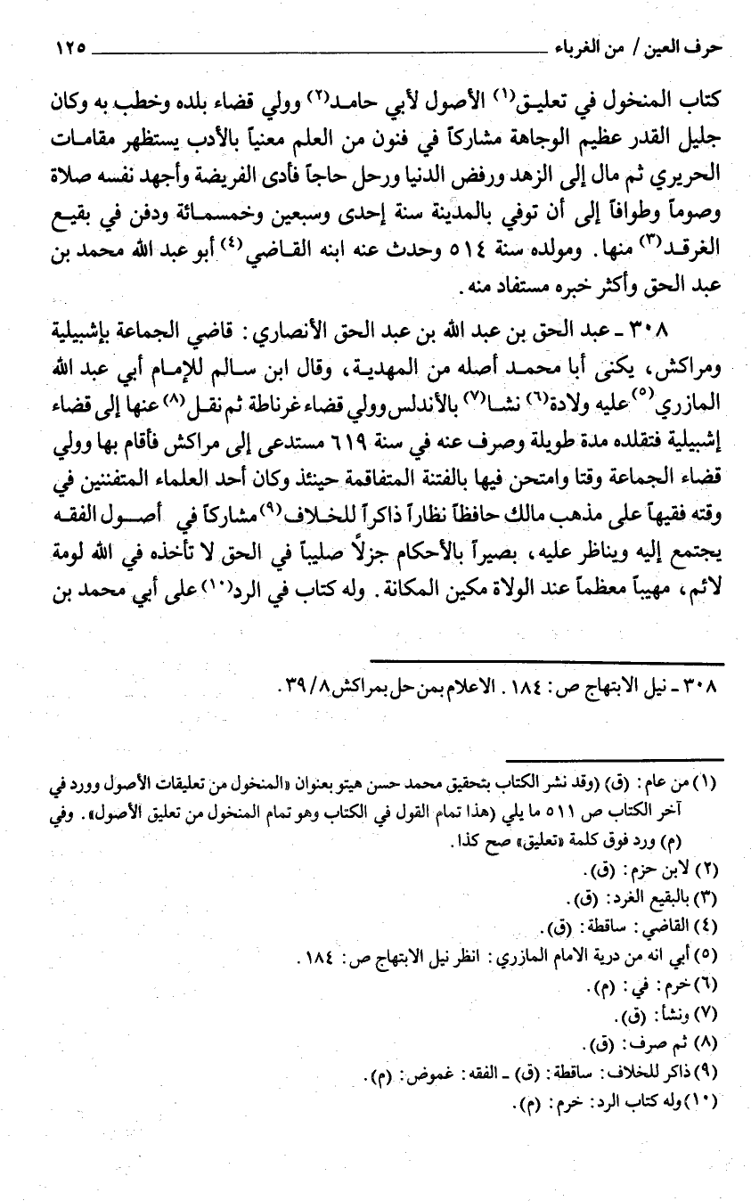 308 - عبد الْحق بن عَبْد اللَّه بْن عَبْد الْحق الْأنْصَارِيّ قَاضِي الْجَمَاعَة بإشبيلية ومراكش يكنى أَبَا مُحَمَّد أَصله من المهدية وَقَالَ ابْن سَالم للْإِمَام أَبِي عبد الله الْمَازرِيّ عَلَيْهِ ولادَة نشا بالأندلس وَولي قَضَاء غرناطة ثمَّ نقل عَنْهَا إِلَى قَضَاء إشبيلية فتقلده مُدَّة طَوِيلَة وَصرف عَنهُ فِي سنة 619 مستدعى إِلَى مراكش فَأَقَامَ بهَا وَولي قَضَاء الْجَمَاعَة وقتا وامتحن فِيهَا بالفتنة المتفاقمة حِينَئِذٍ وَكَانَ أحد الْعلمَاء المتفننين فِي وقته فَقِيها عَليّ مَذْهَب مَالك حَافِظًا نظارا ذَاكِرًا للْخلاف مشاركا فِي أصُول الْفِقْه يجْتَمع إِلَيْهِ ويناظر عَلَيْهِ بَصيرًا بِالْأَحْكَامِ جزلا صليبا فِي الْحق لَا تَأْخُذهُ فِي الله لومه لائم مهيبا مُعظما عِنْد الْوُلَاة مكين المكانة وَله كتاب فِي الرَّد عَليّ أَبِي مُحَمَّد بن