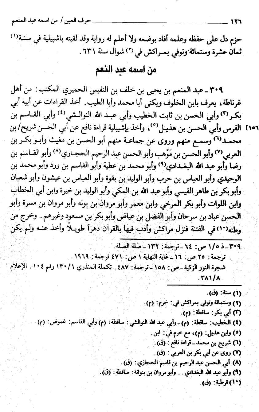 309 - عبد الْمُنعم بن يحيى بن خلف بن النفيس الْحِمْيَرِي الْمكتب من أهل غرناطة يعرف بِابْن الخلوف ويكنى أَبَا مُحَمَّد وَأَبا الطّيب أَخذ الْقرَاءَات عَنْ أَبِيه أبي بكر وَأبي الْحسن بن ثَابت الْخَطِيب وَأبي عبد الله النوالشي وَأبي الْقَاسِم بن الْفرس وَأبي الْحسن بن هُذَيْل وَأخذ بإشبيلية قِرَاءَة نَافِع عَنْ أبي الْحَسَن شُرَيْح بن مُحَمَّد وَسمع مِنْهُم وروى عَن جمَاعَة مِنْهُم أَبُو الْحَسَن بْن مغيث وَأَبُو بَكْر بن الْعَرَبِيّ وَأَبُو الْحسن بن موهب وَأَبُو الْحسن عبد الرَّحِيم الحجاري وَأَبُو الْقَاسِم بن رضَا وَأَبُو عبد الله الْبَغْدَادِيّ وَأَبُو مُحَمَّد بن عَطِيَّة وَأَبُو الْقَاسِم بن ورد وَأَبُو مُحَمَّد بن الوحيدي وَأَبُو الْعَبَّاس بن حَرْب وَأَبُو الْوَلِيد بْن بَقْوَة وَأَبُو الْعَبَّاس بن عيشون وَأَبُو شعْبَان وَأَبُو بكر بن طَاهِر الْقَيْسِي وَأَبُو عبد الله بن الْمَكِّيّ وَأَبُو الْوَلِيد بن خيرة وَابْن أَبِي الْخَطَّاب وَابْن اللوات وَأَبُو بكر المرخي وَابْن مَعْمَر وَأَبُو مَرْوَان بن بونه وَأَبُو مَرْوَان بْن مَسَرَّة وَأَبُو الْحَسَن عبَّاد بْن سرحان وَأَبُو الفَضْل بْن عِيَاض وَأَبُو بَكْر بن مَسْعُود وَغَيرهم وَخرج من وَطنه فِي الْفِتْنَة فَنزل مراكش وأدب فِيهَا بِالْقُرْآنِ دهرا طَويلا وَأخذ عَنهُ وَلم يكن