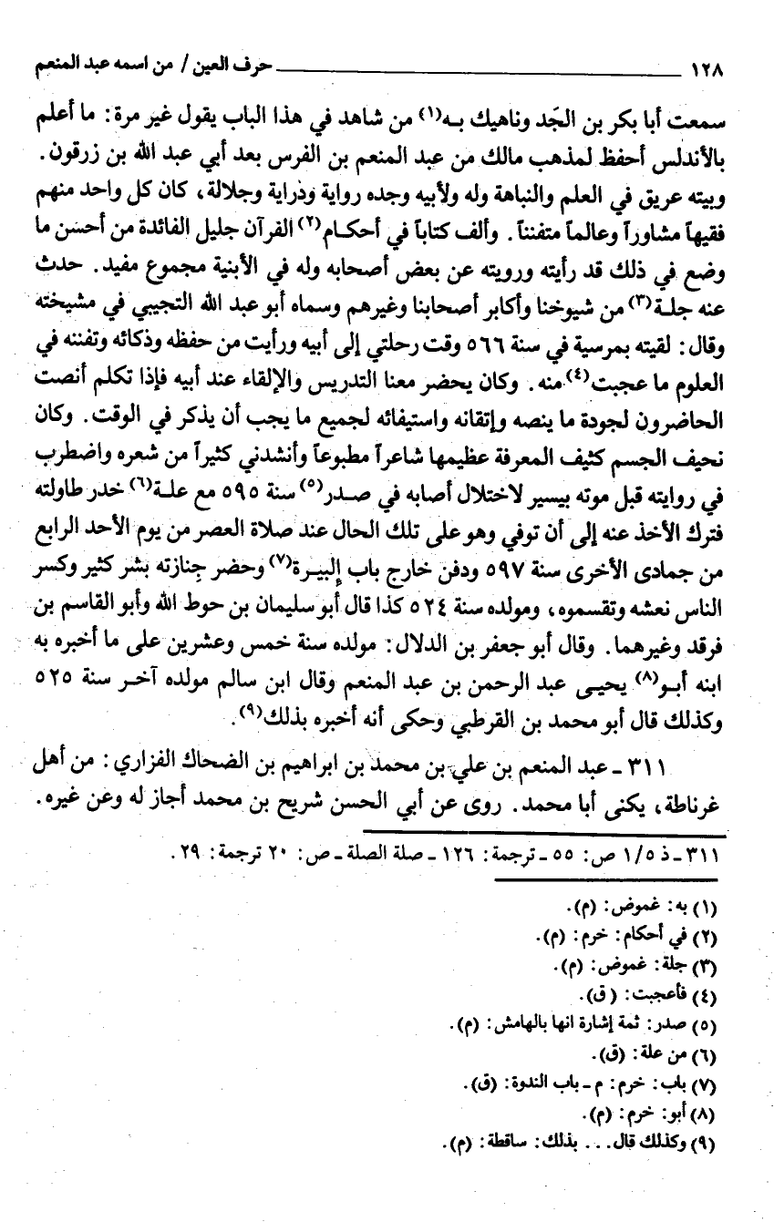 311 - عبد الْمُنعم بْن عَلِيّ بْن مُحَمَّد بْن إِبْرَاهِيم بن الضَّحَّاك الْفَزارِيّ من أهل غرناطة يكنى أَبَا مُحَمَّد روى عَنْ أبي الْحَسَن شُرَيْح بن مُحَمَّد أجَاز لَهُ وَعَن غَيره