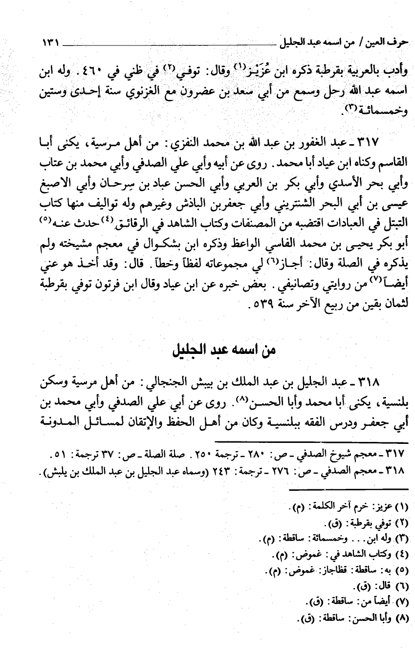 317 - عبد الغفور بن عبد الله بن مُحَمَّد النفزي من أهل مرسية يكنى أَبَا الْقَاسِم وكناه ابْن عياد أَبَا مُحَمَّد روى عَن أَبِيهِ وَأبي عَليّ الصَّدَفِي وَأبي مُحَمَّد بْن عتاب وَأبي بَحر الأسَدِيُ وَأبي بَكْر بْن الْعَرَبِيّ وَأبي الْحَسَن عباد بْن سرحان وَأبي الْأَصْبَغ عِيسَى بن أَبِي الْبَحْر الشنتريني وَأبي جَعْفَر بن الباذش وَغَيرهم وَله تواليف مِنْهَا كتاب التبتل فِي الْعِبَادَات اقتضبه من المصنفات وَكتاب الشَّاهِد فِي الرَّقَائِق حدث عَنهُ أَبُو بكر يحيى بن مُحَمَّد الفاسي الْوَاعِظ وَذكره ابْن بشكوال فِي مُعْجم مشيخته وَلم يذكرهُ فِي الصِّلَة وَقَالَ أجَاز لي مجموعاته لفظا وخطا قَالَ وَقد أَخذ هُوَ عني أَيْضا من روايتي وتصانيفي بعض خَبره عَن ابْن عياد وَقَالَ ابْن فرتون توفّي بقرطبة لثمان بَقينَ من ربيع الآخر سنة 539