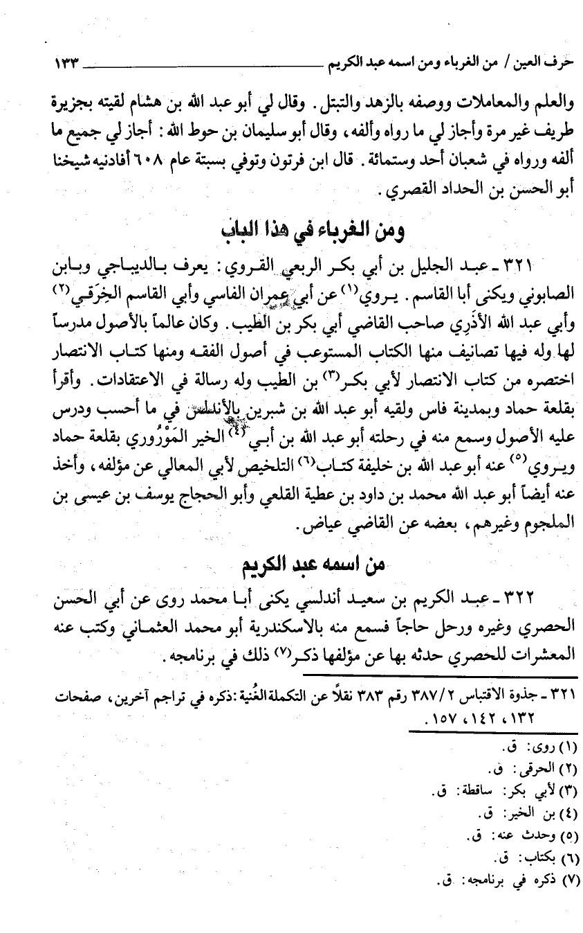 321 - عبد الْجَلِيل بن أَبِي بكر الربعِي الْقَرَوِي يعرف بالديباجي وبابن الصَّابُونِي ويكنى أَبَا القَاسِم يروي عَنْ أبي عمرَان الفاسي وَأبي الْقَاسِم الْخرقِيّ وَأبي عبد الله الأذري صَاحب القَاضِي أَبِي بكر بن الطّيب وَكَانَ عَالما بالأصول مدرسا لَهَا وَله فِيهَا تصانيف مِنْهَا الْكتاب الْمُسْتَوْعب فِي أصُول الْفِقْه وَمِنْهَا كتاب الِانْتِصَار اخْتَصَرَهُ من كتاب الِانْتِصَار لأبي بكر بن الطّيب وَله رِسَالَة فِي الاعتقادات وأقرأ بقلعة حَمَّاد وبمدينة فاس ولقيه أَبُو عَبْد اللَّه بْن شبرين بالأندلس فِي مَا أَحسب ودرس عَلَيْهِ الْأُصُول وَسمع مِنْهُ فِي رحلته أَبُو عبد الله بن أَبِي الْخَيْر الموروري بقلعة حَمَّاد ويروي عَنهُ أَبُو عبد الله بن خَليفَة كتاب التَّلْخِيص لأبي الْمَعَالِي عَن مُؤَلفه وَأخذ عَنْهُ أَيْضا أَبُو عَبْد اللَّه مُحَمَّد بن دَاوُد بن عَطِيَّة القلعي وَأَبُو الْحجَّاج يُوسُف بن عِيسَى بن الملجوم وَغَيرهم بعضه عَن القَاضِي عِيَاض