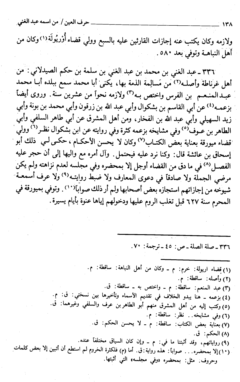 336 - عبد الْغَنِيّ بن مُحَمَّد بن عبد الْغَنِيّ بن سَلمَة بن حكم الصيدلاني من أهل غرناطة وَأَصله من مسالمة الذِّمَّة بهَا يكنى أَبَا مُحَمَّد سمع بِبَلَدِهِ أَبَا مُحَمَّد عبد الْمُنعم بن الْفرس واختص بِهِ ولازمه نَحوا من عشْرين سنة وروى أَيْضا بِزَعْمِهِ عَن أبي الْقَاسِم بن بشكوال وَأبي عَبْد اللَّه بْن زرقون وَأبي مُحَمَّد بن بونة وَأبي زيد السُّهيْلي وَأبي عبد الله بن الفخار وَمن أهل الْمشرق عَن أَبِي طَاهِر السلَفِي وَأبي الطَّاهِر بن عَوْف وَفِي مشايخه بِزَعْمِهِ كَثْرَة وَفِي رِوَايَته عَن ابْن بشكوال نظر وَولي قَضَاء ميورقة بعناية بعض الْكتاب وَكَانَ لَا يحسن الْأَحْكَام حكى لي ذَلِك أَبُو إِسْحَاق بن عَائِشَة قَالَ وَكُنَّا نرد عَلَيْهِ فَيحْتَمل وَآل أمره مَعَ واليها إِلَى أَن حجر عَلَيْهِ الْفَصْل فِي مَا دق من الْقَضَاء أوجل إِلَّا بمحضره وَفِي مَجْلِسه لعدم نزاهته وَلم يكن مرضِي الْجُمْلَة وَلَا صَادِقا فِي دَعْوَى المعارف وَلَا ضبط رِوَايَته وَلَا عرف أسمعهُ شُيُوخه من إجازاتهم استجازه بعض أَصْحَابها وَلم أر ذَلِك صَوَابا وَتُوفِّي بميورقة فِي الْمحرم سنة 627 قبل تغلب الرّوم عَلَيْهَا ودخولهم إِيَّاهَا عنْوَة بأيام يسيرَة