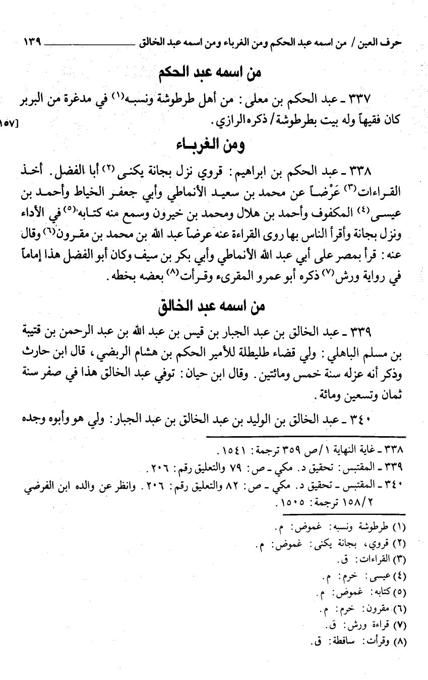 338 - عبد الحكم بن إِبْرَاهِيم قروي نزل بجانة يكنى أَبَا الْفضل أَخذ الْقرَاءَات عرضا عَن مُحَمَّد بن سعيد الْأنمَاطِي وَأبي جَعْفَر الْخياط وَأَحْمَد بن عِيسَى المكفوف وَأَحْمَد بن هِلَال وَمُحَمّد بن خيرون وَسمع مِنْهُ كِتَابه فِي الْأَدَاء وَنزل بجانة وأقرأ النَّاس بهَا روى الْقِرَاءَة عَنهُ عرضا عبد الله بن مُحَمَّد بن مقرون وَقَالَ عَنهُ قَرَأَ بِمصْر عَليّ أَبِي عبد الله الْأنمَاطِي وَأبي بكر بن سيف وَكَانَ أَبُو الْفضل هَذَا إِمَامًا فِي رِوَايَة ورش ذكره أَبُو عَمْرو المقرىء وقرأت بعضه بِخَطِّهِ