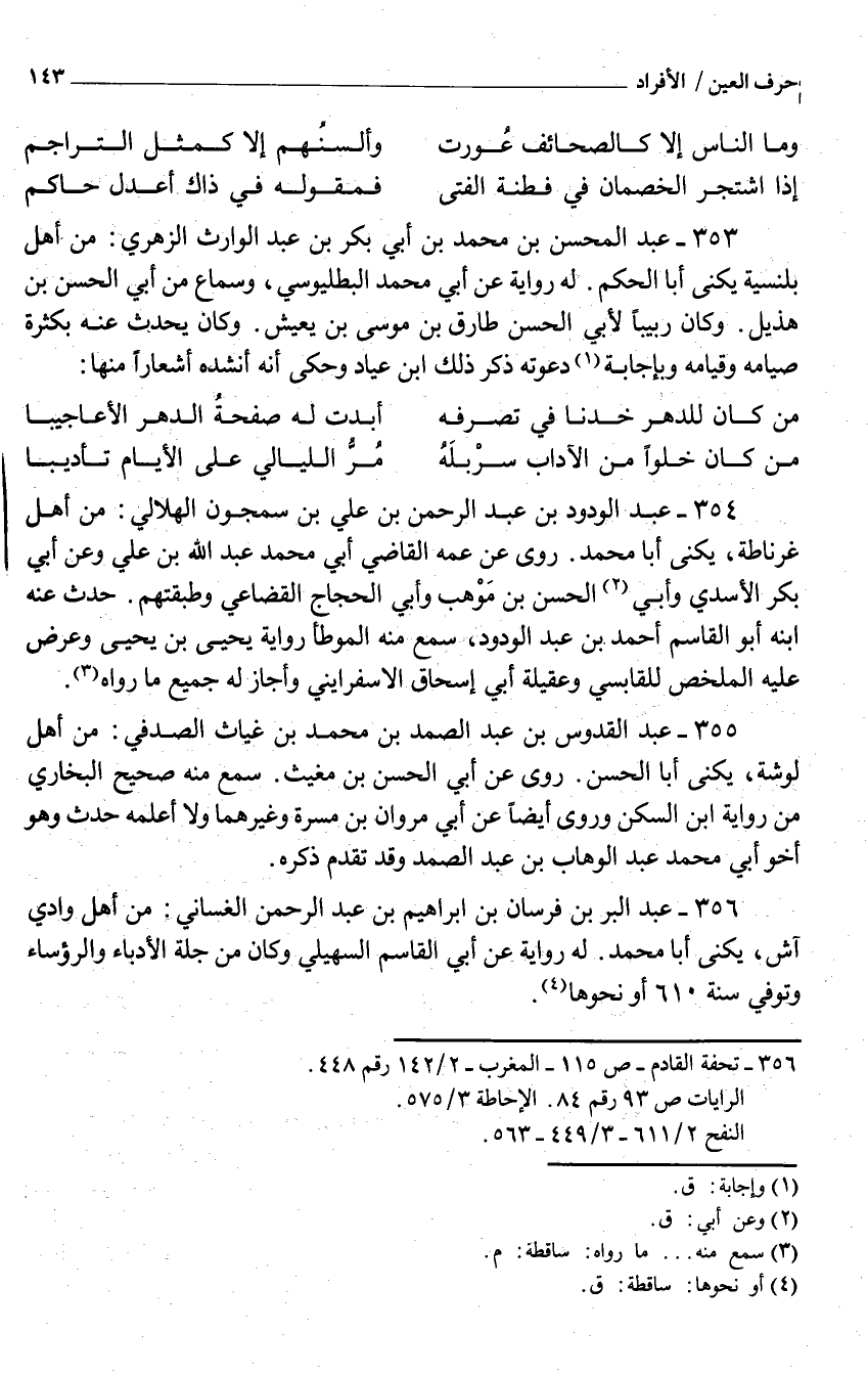 356 - عبد الْبر بن فرسَان بن إِبْرَاهِيم بن عبد الرَّحْمَن الغساني من أهل وَادي آش يكنى أَبَا مُحَمَّد لَهُ رِوَايَة عَن أبي الْقَاسِم السُّهيْلي وَكَانَ من جلة الأدباء والرؤساء وَتُوفِّي سنة 610 أَو نَحْوهَا