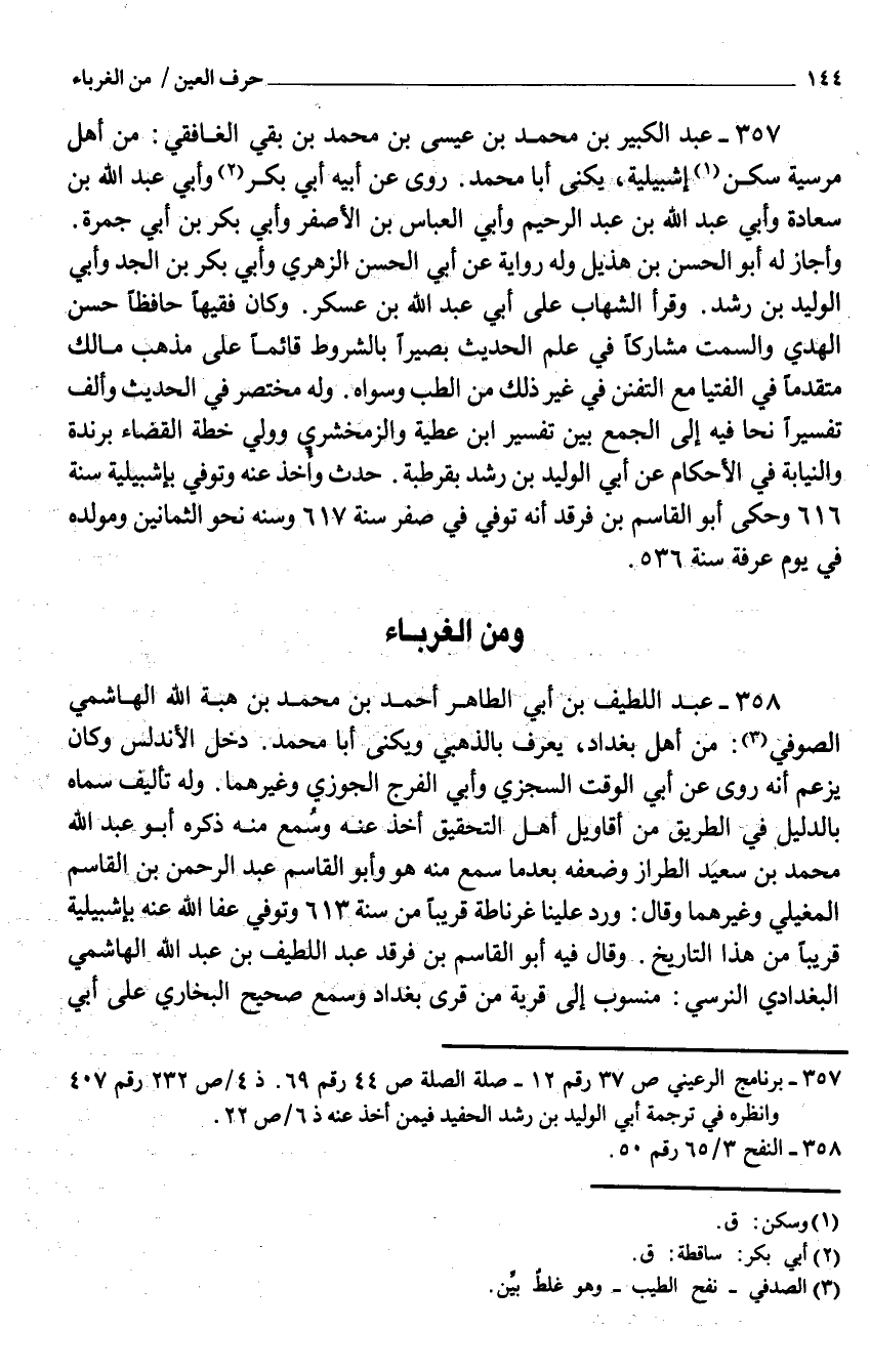 357 - عبد الْكَبِير بن مُحَمَّد بن عِيسَى بْن مُحَمَّد بْن بَقِي الغافقي من أهل مرسية سكن إشبيلية يكنى أَبَا مُحَمَّد روى عَن أَبِيهِ أَبِي بكر وَأبي عَبْد اللَّه بْن سَعَادَة وَأبي عَبْد اللَّه بْن عَبْد الرَّحِيم وَأبي الْعَبَّاس بن الْأَصْفَر وَأبي بكر بن أبي جَمْرَة وَأَجَازَ لَهُ أَبُو الْحسن بن هُذَيْل وَله رِوَايَة عَنْ أبي الْحَسَن الزُّهْرِيّ وَأبي بكر بن الْجد وَأبي الْوَلِيد بن رشد وَقَرَأَ الشهَاب عَليّ أَبِي عبد الله بن عَسْكَر وَكَانَ فَقِيها حَافِظًا حسن الْهَدْي والسمت مشاركا فِي علم الحَدِيث بَصيرًا بِالشُّرُوطِ قَائِما عَليّ مَذْهَب مَالك مُتَقَدما فِي الْفتيا مَعَ التفنن فِي غير ذَلِك من الطِّبّ وسواه وَله مُخْتَصر فِي الحَدِيث وَألف تَفْسِيرا نحا فِيهِ إِلَى الْجمع بَين تَفْسِير ابْن عَطِيَّة والزمخشري وَولي خطة الْقَضَاء برندة والنيابة فِي الْأَحْكَام عَن أَبِي الْوَلِيد بن رشد بقرطبة حدث وَأخذ عَنهُ وَتُوفِّي بإشبيلية سنة 616 وَحكى أَبُو الْقَاسِم بن فرقد أَنه توفّي فِي صفر سنة 617 وسنه نَحْو الثَّمَانِينَ ومولده فِي يَوْم عَرَفَة سنة 536