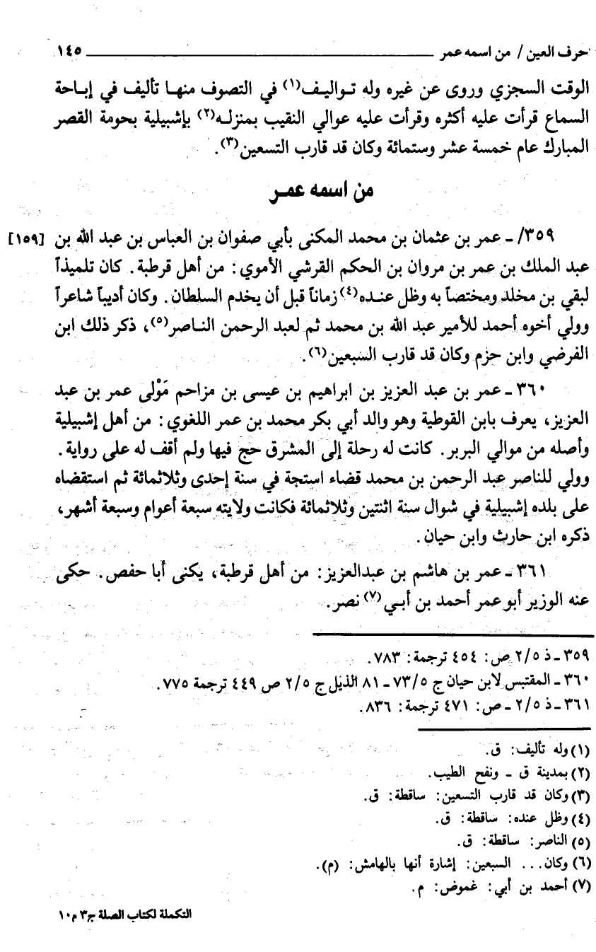 359 - عمر بن عُثْمَان بن مُحَمَّد المكني بِأبي صَفْوَان بن الْعَبَّاس بن عبد الله بْن عَبْد الْملك بْن عُمَر بن مَرْوَان بن الحكم الْقرشِي الْأمَوِي من أهل قرطبة كَانَ تلميذا لبقي بن مخلد ومختصا بِهِ وظل عِنْده زَمَانا قبل أَن يخْدم السُّلْطَان وَكَانَ أديبا شَاعِرًا وَولي أَخُوهُ أَحْمد للأمير عبد الله بن مُحَمَّد ثمَّ لعبد الرَّحْمَن النَّاصِر ذكر ذَلِك ابْن الفرضي وَابْن حزم وَكَانَ قد قَارب السّبْعين