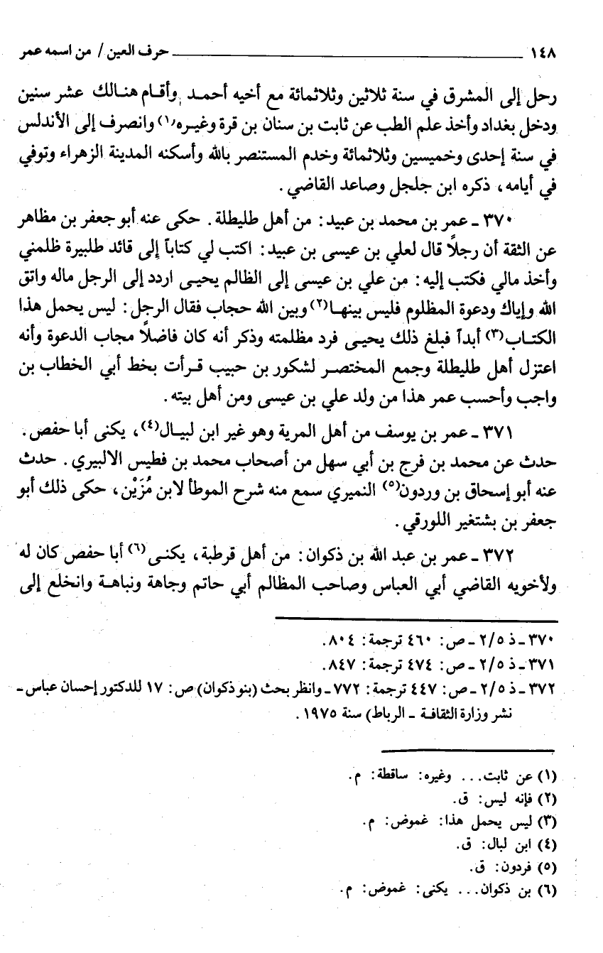 370 - عمر بن مُحَمَّد بن عبيد من أهل طليطلة حكى عَنهُ أَبُو جَعْفَر بن مظَاهر عَن الثِّقَة أَن رجلا قَالَ لعَلي بن عيسي بن عبيد اكْتُبْ لي كتابا إِلَى قَائِد طلبيرة ظَلَمَنِي وَأخذ مَالِي فَكتب إِلَيْهِ من عَليّ بن عيسي إِلَى الظَّالِم يحيى ارْدُدْ إِلَى الرجل مَاله وَاتَّقِ الله وَإِيَّاك ودعوة الْمَظْلُوم فَلَيْسَ بَينهَا وَبَين الله حجاب فَقَالَ الرجل لَيْسَ يحمل هَذَا الْكتاب أبدأ فَبلغ ذَلِك يحيى فَرد مظلمته وَذكر أَنه كَانَ فَاضلا مجاب الدعْوَة وَأَنه اعتزل أهل طليطلة وَجمع الْمُخْتَصر لشكور بن حبيب قَرَأت بِخَط أَبِي الْخَطَّاب بن وَاجِب وأحسب عمر هَذَا من ولد عَليّ بن عيسي وَمن أهل بَيته