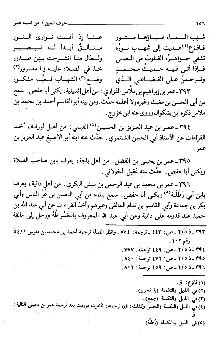 396 - عمر بْن مُحَمَّد بْن عَبْد الرَّحْمَن بن بيبش الْبكْرِيّ من أهل دانية يعرف بِابْن أَبِي رطلة ويكنى أَبَا حَفْص سمع بِبَلَدِهِ من أَبِي الْحسن بن غر النَّاس وَأبي بكر بن جمَاعَة وَأبي الْقَاسِم بن تَمام المالقي وَغَيرهم وَأخذ الْقرَاءَات عَنْ أبي عبد الله بن حميد عِنْد قدومه على دانية وَعَن أبي عبد الله الْمَعْرُوف بالخسراطه ورحل إِلَى مالقة
