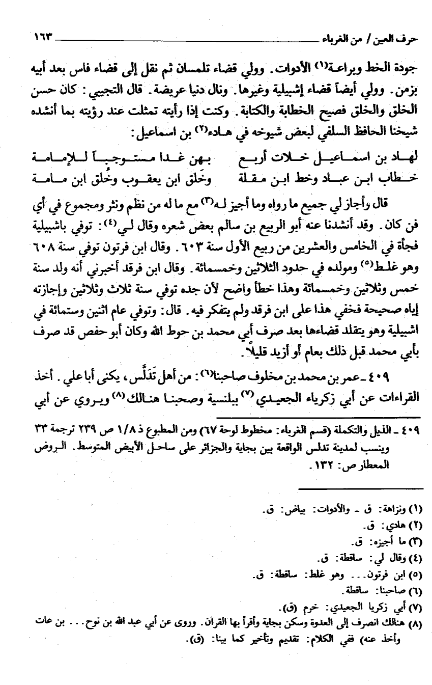 409 - عمر بن مُحَمَّد بن مخلوف صاحبنا من أهل تدلس يكنى أَبَا عَلِيّ أَخذ الْقرَاءَات عَنْ أبي زَكَرِيَّاء الجعيدي ببلنسية وصحبنا هُنَالك ويروي عَنْ أبي
