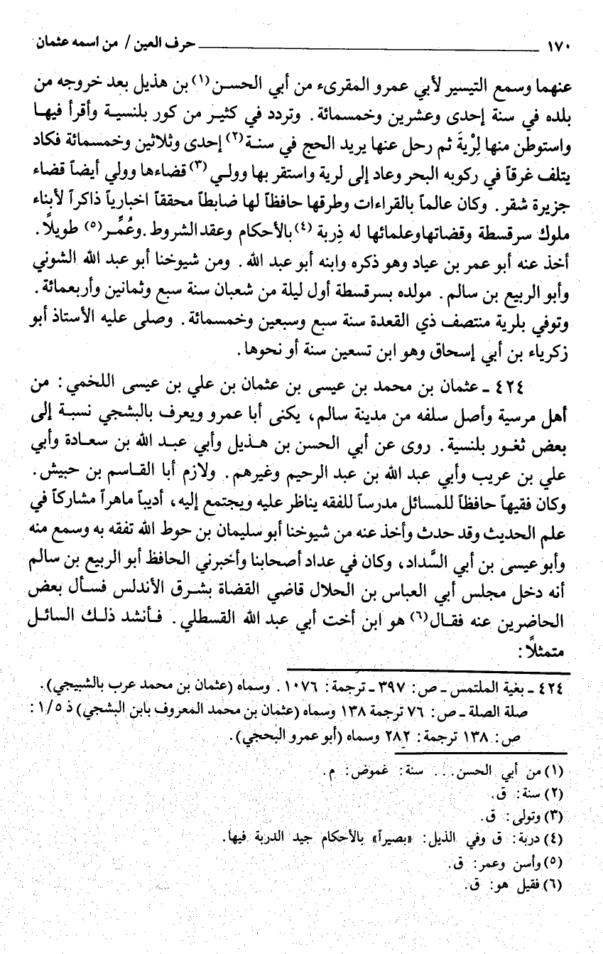 424 - عُثْمَان بْن مُحَمَّد بْن عِيسَى بْن عُثْمَان بن عَليّ بن عِيسَى اللَّخْمِيّ من أهل مرسية وأصل سلفه من مَدِينَة سَالم يكنى أَبَا عَمْرو وَيعرف بالبشجي نِسْبَة إِلَى بعض ثغور بلنسية روى عَنْ أبي الْحَسَن بْن هُذَيْل وَأبي عَبْد اللَّه بْن سَعَادَة وَأبي عَليّ بْن عَرِيب وَأبي عَبْد اللَّه بْن عَبْد الرَّحِيم وَغَيرهم ولازم أَبَا الْقَاسِم بن حُبَيْش وَكَانَ فَقِيها حَافِظًا للمسائل مدرسا للفقه يناظر عَلَيْهِ ويجتمع إِلَيْهِ أديبا ماهرا مشاركا فِي علم الحَدِيث وَقد حدث وَأخذ عَنْهُ من شُيُوخنَا أَبُو سُلَيْمَان بن حوط الله تفقه بِهِ وَسمع مِنْهُ وَأَبُو عيسي بن أَبِي السداد وَكَانَ فِي عداد أَصْحَابنا وَأَخْبرنِي الْحَافِظ أَبُو الرَّبِيع بن سَالم أَنه دَخَلَ مجْلِس أَبِي الْعَبَّاس بن الْحَلَال قَاضِي الْقُضَاة بشرق الأندلس فَسَأَلَ بعض الْحَاضِرين عَنهُ فَقَالَ هُوَ ابْن أُخْت أَبِي عبد الله القسطلي فَأَنْشد ذَلِك السَّائِل متمثلا