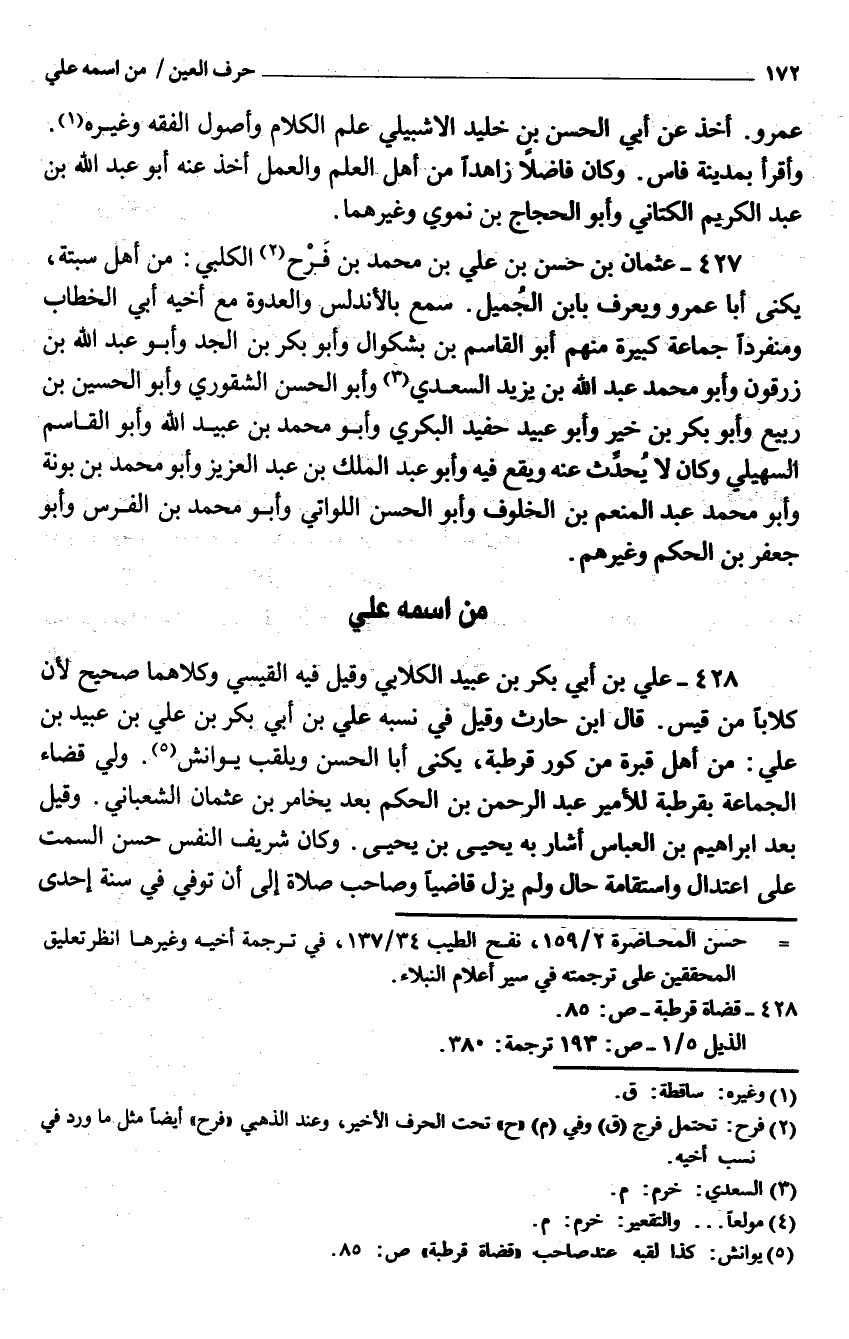 428 - عَليّ بن أَبِي بكر بن عبيد الْكلابِي وَقيل فِيهِ الْقَيْسِي وَكِلَاهُمَا صَحِيح لِأَن كلابا من قيس قَالَ ابْن الْحَارِث وَقيل فِي نسبه عَليّ بن أبي بَكْر بْن عَلِيّ بْن عبيد بن عَليّ من أهل قبرة يكنى أَبَا الْحسن ويلقب يوانش وُلّي قَضَاء الْجَمَاعَة بقرطبة للأمير عَبْد الرَّحْمَن بْن الحكم بَعْدَ يخَامر بن عُثْمَان الشَّعْبَانِي وَقيل بعد إِبْرَاهِيم بن الْعَبَّاس أَشَارَ بِهِ يحيى بن يحيى وَكَانَ شرِيف النَّفس حسن السمت عَليّ اعْتِدَال واستقامة حَال وَلم يزل قَاضِيا وَصَاحب صَلَاة إِلَى أَن توفّي فِي سنة إِحْدَى