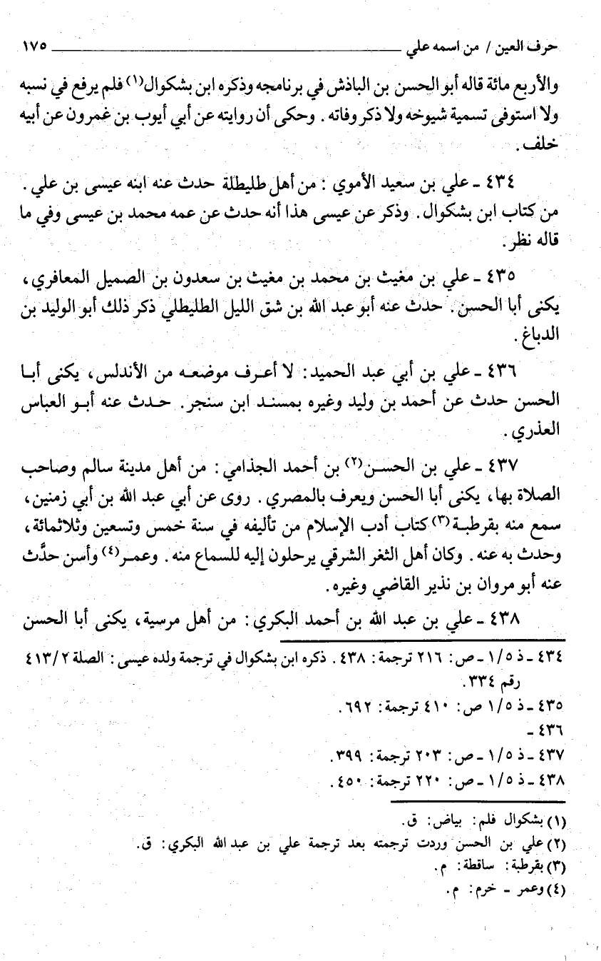 434 - عَليّ بن سعيد الْأمَوِي من أهل طليطلة حدث عَنهُ ابْنه عيسي بن عَليّ من كتاب ابْن بشكوال وَذكر عَن عيسي هَذَا أَنه حدث عَن عَمه مُحَمَّد بن عيسي وَفِي مَا قَالَه نظر