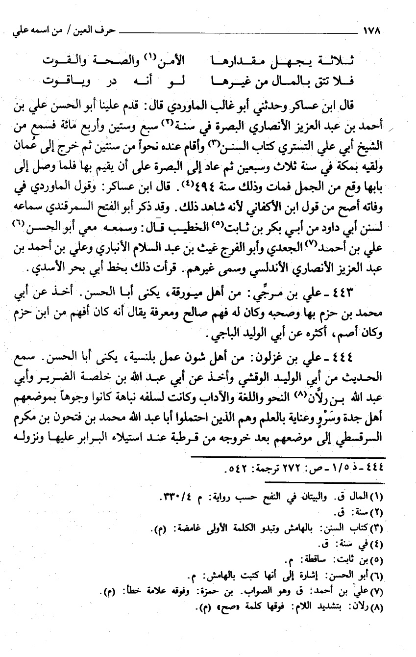 444 - عَليّ بن غزلون من أهل شون عمل بلنسية يكنى أَبَا الْحسن سمع الحَدِيث من أَبِي الْوَلِيد الوقشي وَأخذ عَن أَبِي عبد الله بن خلصة الضَّرِير وَأبي عبد الله بن رلان النَّحْو واللغة والآداب وَكَانَت لسلفه نباهة كَانُوا وُجُوهًا بموضعهم أهل جدة وسرو وعناية بِالْعلمِ وهم الَّذين احتملوا أَبَا عَبْد اللَّه مُحَمَّد بْن فتحون بن مكرم السَّرقسْطِي إِلَى موضعهم بعد خُرُوجه من قرطبة عِنْد اسْتِيلَاء البرابر عَلَيْهَا ونزوله