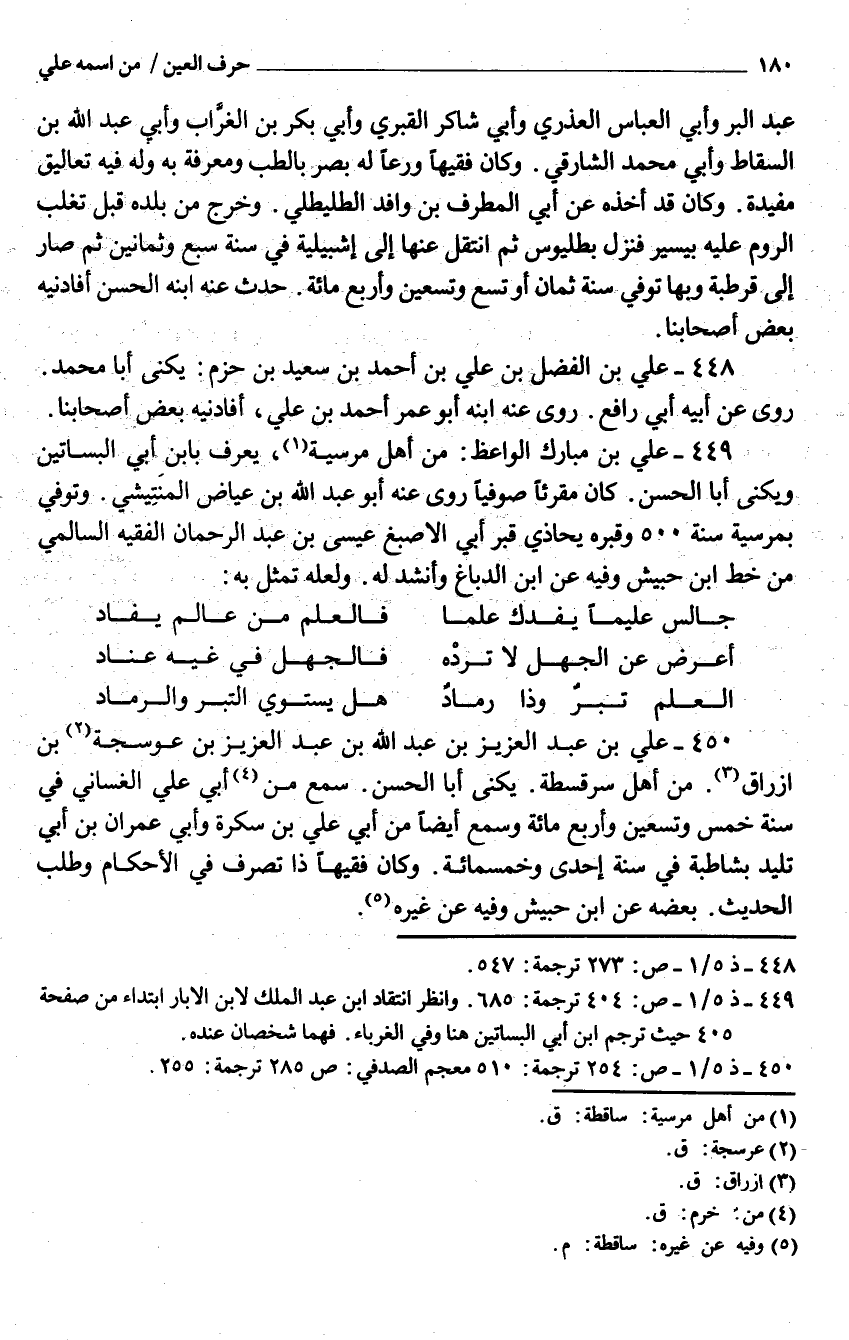 449 - عَليّ بن مبارك الْوَاعِظ من أهل مرسية يعرف بِابْن أَبِي الْبَسَاتِين ويكنى أَبَا الْحسن كَانَ مقرئا صوفيا روى عَنهُ أَبُو عبد الله بن عِيَاض المنتيشي وَتُوفِّي بمرسية سنة 500 وقبره يُحَاذِي قبر أَبِي الْأَصْبَغ عِيسَى بن عبد الرحمان الْفَقِيه السالمي من خطّ ابْن حُبَيْش وَفِيه عَنْ ابْن الدّباغ وَأنْشد لَهُ وَلَعَلَّه تمثل بِهِ