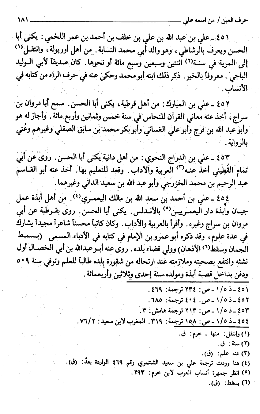 452 - عَليّ بن الْمُبَارك من أهل قرطبة يكنى أَبَا الْحسن سمع أَبَا مَرْوَان بن سراج أَخذ عَنهُ مَعَاني الْقُرْآن للنحاس فِي سنة خمس وَثَمَانِينَ وَأَرْبع مائَة وَأَجَازَ لَهُ هُوَ وَأَبُو عَبْد اللَّه بْن فرج وَأَبُو عَليّ الغساني وَأَبُو بكر مُحَمَّد بن سَابق الصّقليّ وَغَيرهم وعني بالرواية