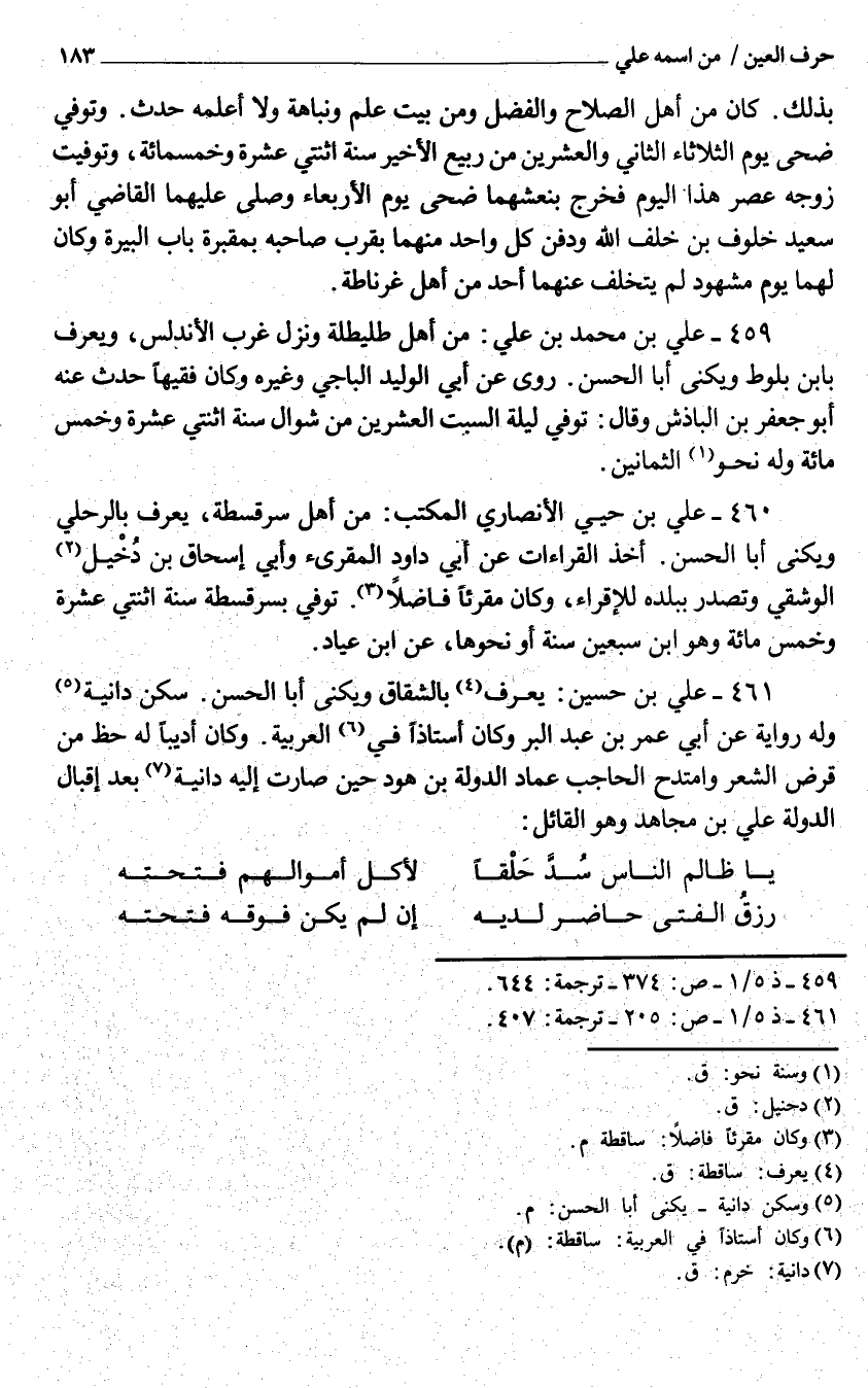 460 - عَليّ بن حييّ الْأنْصَارِيّ الْمكتب من أهل سرقسطة يعرف بالرحلي ويكنى أَبَا الْحسن أَخذ الْقرَاءَات عَن أبي دَاوُد المقرىء وَأبي إِسْحَاق بن دخيل الوشقي وتصدر بِبَلَدِهِ للإقراء وَكَانَ مقرئا فَاضلا توفّي بسرقسطة سنة اثْنَتَيْ عشرَة وَخمْس مائَة وَهُوَ ابْن سبعين سنة أَو نَحْوهَا عَن ابْن عياد