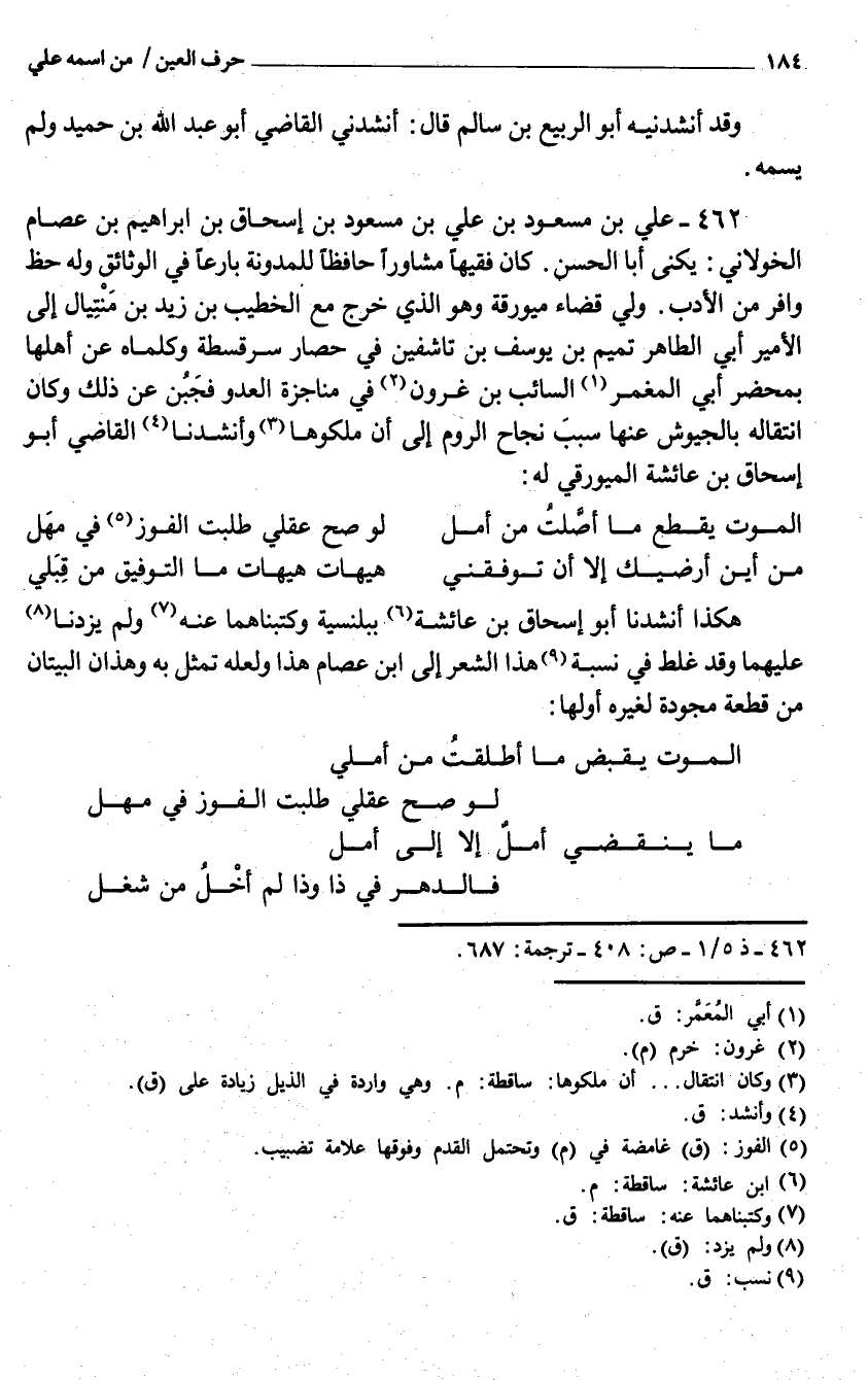 462 - عَليّ بن مَسْعُود بن عَليّ بن مَسْعُود بن إِسْحَاق بن إِبْرَاهِيم بن عِصَام الْخَولَانِيّ يكنى أَبَا الْحَسَن كَانَ فَقِيها مشاورا حَافِظًا للْمُدَوّنَة بارعا فِي الوثائق وَله حَظّ وافر من الْأَدَب ولي قَضَاء ميورقة وَهُوَ الَّذِي خرج مَعَ الْخَطِيب بن زيد بن منتيال إِلَى الْأَمِير أَبِي الطَّاهِر تَمِيم بن يُوسُف بن تاشفين فِي حِصَار سرقسطة وَكَلَّمَاهُ عَن أَهلهَا بِمحضر أَبِي المغمر السَّائِب بن غرون فِي مناجزة الْعَدو فجبن عَن ذَلِك وَكَانَ انْتِقَاله بالجيوش عَنْهَا سَبَب نجاح الرّوم إِلَى أَن ملكوها وأنشدنا القَاضِي أَبُو إِسْحَاق بن عَائِشَة الميورقي لَهُ