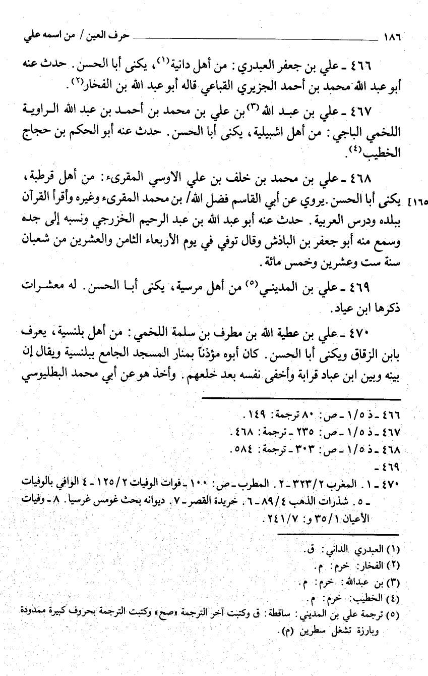 469 - عَليّ بن الْمَدِينِيّ من أهل مرسية يكنى أَبَا الْحسن لَهُ معشرات ذكرهَا ابْن عياد