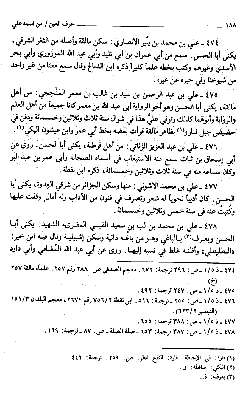 474 - عَليّ بن مُحَمَّد بن ينير الْأنْصَارِيّ سكن مالقة وَأَصله من الثغر الشَّرْقِي يكنى أَبَا الْحسن سَمِعَ من أبي عِمْرَانَ بْن أبي تليد وَأبي عَبْد اللَّه الموروري وَأبي بَحر الْأَسدي وَغَيرهم وَكتب بِخَطِّهِ علما كثيرا ذكره ابْن الدّباغ وَقَالَ سمع مَعنا من غير وَاحِد من شُيُوخنَا وَفِي خَبره عَن غَيره