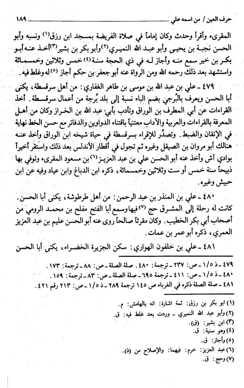 479 - عَليّ بن عبد الله بن مُوسَى بن طَاهِر الْغِفَارِيّ من أَهْلَ سرقسطة يكنى أَبَا الْحسن وَيعرف بالبرجي بِضَم الْبَاء نِسْبَة إِلَى بلد برجة من أَعمال سرقسطة أَخذ الْقرَاءَات عَن أَبِي الْمطرف بن الْوراق وتأدب بِأبي عبد الله بن الخراز وَكَانَ من أهل الْمعرفَة بالقراءات والعربية والآداب معتنيا باقتناء الدَّوَاوِين والدفاتر مَعَ حسن الْخط نِهَايَة فِي الإتقان والضبط وتصدر للإقراء بسرقسطة فِي حَيَاة شيخة ابْن الْوراق وَأخذ عَنهُ هُنَالك أَبُو مَرْوَان بن الصَّقِيل وَغَيره ثمَّ تجول فِي أقطار الأندلس بعد ذَلِك وَاسْتقر أخيرا بوادي آش وَأخذ عَنهُ أَبُو الْحسن عَليّ بن عبد الْعَزِيز بن مَسْعُود المقرىء وَتُوفِّي بهَا ذبيحا سنة خمس أَو سِتّ وَثَلَاثِينَ وَخَمْسمِائة ذكره ابْن الدّباغ وَابْن عياد وَفِيه عَن ابْن حُبَيْش وَغَيره