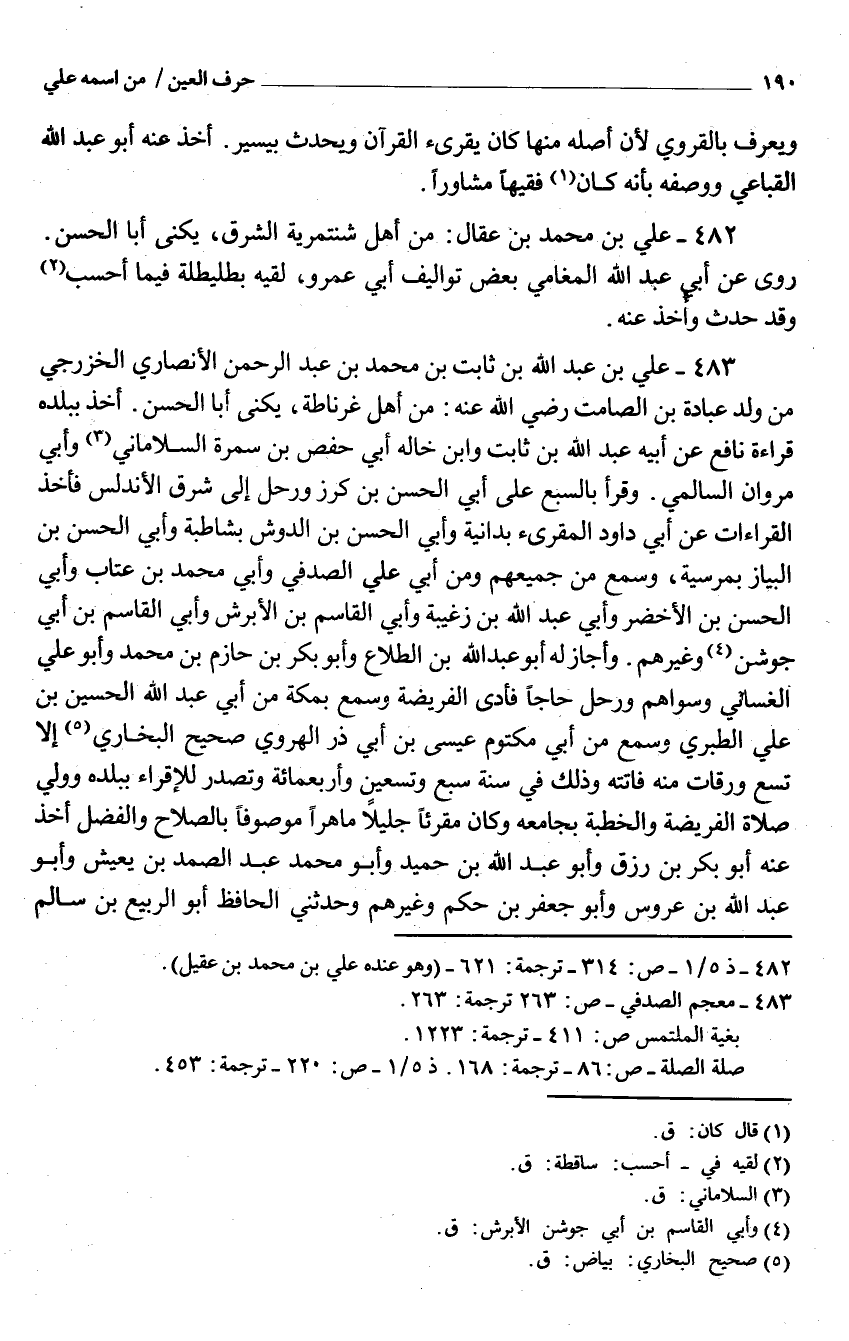 483 - عَليّ بْن عَبْد اللَّه بْن ثَابت بْن مُحَمَّد بْن عَبْد الرَّحْمَن الْأنْصَارِيّ الخزرجي من وَلَده عبَادَة بن الصَّامِت رَضِي الله عَنهُ من أهل غرناطة يكنى أَبَا الْحسن أَخذ بِبَلَدِهِ قِرَاءَة نَافِع عَن أَبِيهِ عبد الله بن ثَابت وَابْن خَاله أَبِي حَفْص بن سَمُرَة السلاماني وَأبي مَرْوَان السالمي وَقَرَأَ بالسبع عَليّ أَبِي الْحسن بن كرز ورحل إِلَى شَرق الأندلس فَأخذ الْقرَاءَات عَن أبي دَاوُد المقرىء بدانية وَأبي الْحسن بن الدوش بشاطبة وَأبي الْحسن بن البياز بمرسية وَسمع من جَمِيعهم وَمن أبي عَلِيّ الصَّدَفِي وَأبي مُحَمَّد بْن عتاب وَأبي الْحَسَن بْن الْأَخْضَر وَأبي عبد الله بن زغيبة وَأبي الْقَاسِم بن الأبرش وَأبي الْقَاسِم بن أَبِي جوشن وَغَيرهم وَأَجَازَ لَهُ أبوعبد الله بن الطلاع وَأَبُو بكر بن حَازِم بن مُحَمَّد وَأَبُو عَليّ الغساني وسواهم ورحل حَاجا فَأدى الْفَرِيضَة وَسمع بِمَكَّة من أبي عَبْد اللَّه الْحُسَيْن بْن عَليّ الطَّبَرِيّ وَسمع من أَبِي مَكْتُوم عِيسَى بْن أبي ذَر الْهَرَوِيّ صَحِيح الْبُخَارِي إِلَّا تسع وَرَقَات مِنْهُ فَاتَتْهُ وَذَلِكَ فِي سنة سبع وَتِسْعين وَأَرْبَعمِائَة وتصدر للإقراء بِبَلَدِهِ وَولي صَلَاة الْفَرِيضَة وَالْخطْبَة بجامعه وَكَانَ مقرئا جَلِيلًا ماهرا مَوْصُوفا بالصلاح وَالْفضل أَخذ عَنْهُ أَبُو بَكْر بْن رزق وَأَبُو عَبْد اللَّه بْن حُمَيْد وَأَبُو مُحَمَّد عبد الصَّمد بن يعِيش وَأَبُو عَبْد اللَّه بْن عروس وَأَبُو جَعْفَر بن حكم وَغَيرهم وحَدثني الْحَافِظ أَبُو الرَّبِيع بن سَالم
