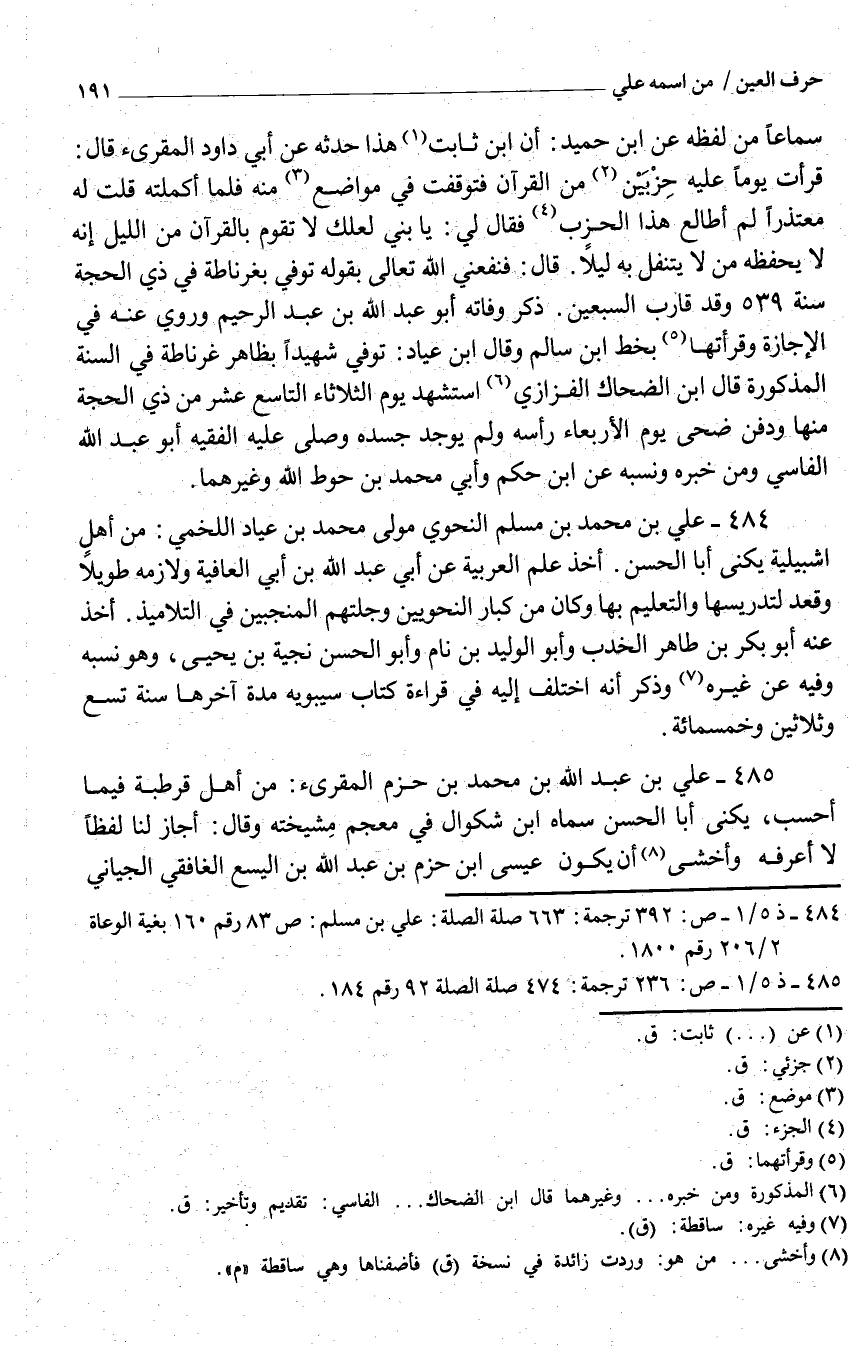 484 - عَليّ بن مُحَمَّد بن مُسلم النَّحْوِيّ مولي مُحَمَّد بن عياد اللَّخْميّ من أَهْلَ إشبيلية يكنى أَبَا الْحسن أَخذ علم الْعَرَبيَّة عَنْ أبي عَبْد اللَّه بْن أَبِي الْعَافِيَة ولازمه طَويلا وَقعد لتدريسها والتعليم بهَا وَكَانَ من كبار النَّحْوِيين وجلتهم المنجبين فِي التلاميذ أَخذ عَنهُ أَبُو بكر بن طَاهِر الخدب وَأَبُو الْوَلِيد بن نَام وَأَبُو الْحسن نجيه بن يحيى وَهُوَ نسبه وَفِيه عَن غَيره وَذكر أَنه اخْتلف إِلَيْهِ فِي قِرَاءَة كتاب سِيبَوَيْهٍ مُدَّة آخرهَا سنة تسع وَثَلَاثِينَ وَخَمْسمِائة