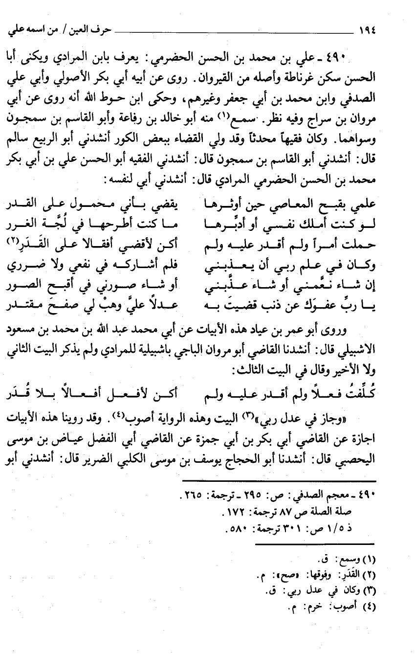 490 - عَليّ بن مُحَمَّد بن الْحسن الْحَضْرَمِيّ يعرف بِابْن الْمرَادِي ويكنى أَبَا الْحسن سكن غرناطة وَأَصله من القيروان روى عَن أَبِيهِ أَبِي بكر الأصولي وَأبي عَليّ الصَّدَفِي وَابْن مُحَمَّد بن أَبِي جَعْفَر وَغَيرهم وَحكى ابْن حوط الله أَنه روى عَن أَبِي مَرْوَان بن سراج وَفِيه نظر سمع مِنْهُ أَبُو خَالِد بن رِفَاعَة وَأَبُو الْقَاسِم بن سمجون وسواهما وَكَانَ فَقِيها مُحدثا وَقد ولي الْقَضَاء بِبَعْض الكور أَنْشدني أَبُو الرَّبِيع سَالم قَالَ أَنْشدني أَبُو الْقَاسِم بن سمجون قَالَ أَنْشدني الْفَقِيه أبوالحسن عَليّ بن أَبِي بكر مُحَمَّد بن الْحسن الْحَضْرَمِيّ الْمرَادِي قَالَ أَنْشدني أَبِي لنَفسِهِ