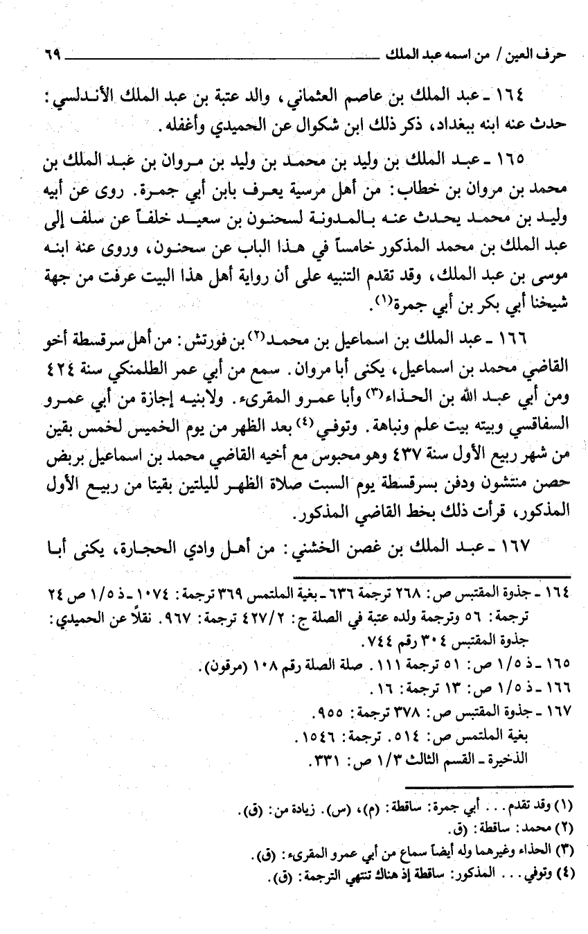 166 - عبد الْملك بن إِسْمَاعِيل بن مُحَمَّد بن فورتش من أهل سرقسطة أَخُو القَاضِي مُحَمَّد بن إِسْمَاعِيل يكنى أَبَا مَرْوَان سَمِعَ من أَبِي عمر الطلمنكي سنة 424 وَمن أبي عَبْد اللَّه بْن الْحذاء وَأَبا عَمْرو المقرىء ولابنيه إجَازَة من أَبِي عَمْرو السفاقسي وبيته بَيت علم ونباهة وَتُوفِّي بعد الظّهْر من يَوْم الْخَمِيس لخمس بَقينَ من شهر ربيع الأول سنة 437 وَهُوَ مَحْبُوس مَعَ أَخِيه القَاضِي مُحَمَّد بن إِسْمَاعِيل بربض حصن منتشون وَدفن بسرقسطة يَوْم السبت صَلَاة الظّهْر لليلتين بَقِيَتَا من ربيع الأول الْمَذْكُور قَرَأت ذَلِك بِخَط القَاضِي الْمَذْكُور 167 عبد الْملك بن غُصْن الْخُشَنِي من أهل وَادي الْحِجَارَة يكنى أَبَا