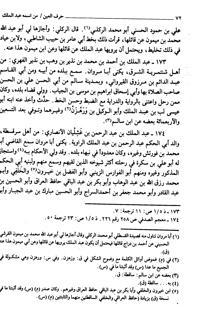 174 - عبد الْملك بن عبد الرَّحْمَن بن غشليان الْأنْصَارِيّ من أهل سرقسطة وَالِد أَبِي الحكم عبد الرَّحْمَن بن عبد الْملك الراوية يكنى أَبَا مَرْوَان سمع القَاضِي أَبَا مُحَمَّد بن فورتش وَغَيره وَكَانَ معدودا فِي نبهاء بَلَده وَقد ولي الْأَحْكَام بِهِ واستجاز لَهُ أَبُو عَليّ بن سكرة فِي رحلته أَكْثَر شُيُوخه الَّذين لَقِيَهُمْ وَسمع مِنْهُم ولبنيه أَبِي الحكم الْمَذْكُور وَغَيره وَمِنْهُم أَبُو الفوارس الزَّيْنَبِي وَأَبُو الْفضل بن خيرون والخلفي وَأَبُو مُحَمَّد رزق الله بن عبد الْوَهَّاب وَأَبُو بكر بن عبد الْبَاقِي حَافظ الْعرَاق وَأَبُو الْحُسَيْن بن عبد الْقَادِر وَأَبُو مُحَمَّد جَعْفَر بن أَحْمد السراج وَأَبُو الْحُسَيْن مبارك بن عبد الْجَبَّار وَأَبُو