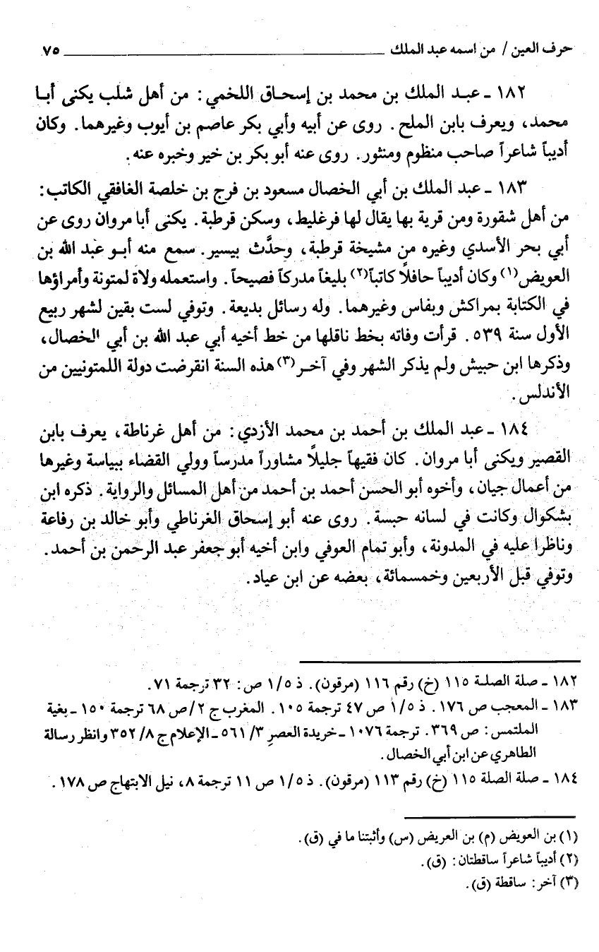 183 - عبد الْملك بن أَبِي الْخِصَال مَسْعُود بن فرج بن خلصة الغافقي الْكَاتِب من أهل شقورة وَمن قَرْيَة بهَا يُقَال لَهَا فرغليط وَسكن قرطبة يكنى أَبَا مَرْوَان روى عَنْ أبي بَحر الأسَدِيُ وَغَيره من مشيخة قرطبة وَحدث بِيَسِير سمع مِنْهُ أَبُو عبد الله بن العويض وَكَانَ أديبا حافلا كَاتبا بليغا مدْركا فصيحا وَاسْتَعْملهُ وُلَاة لمتونة وأمراؤها فِي الْكِتَابَة بمراكش وبفاس وَغَيرهمَا وَله رسائل بديعة وَتُوفِّي لست بَقينَ لشهر ربيع الأول سنة 539 قَرَأت وَفَاته بِخَط ناقلها من خطّ أَخِيه أَبِي عبد الله بن أَبِي الْخِصَال وَذكرهَا ابْن حُبَيْش وَلم يذكر الشَّهْر وَفِي آخر هَذِه السّنة انقرضت دولة اللمتونيين من الأندلس