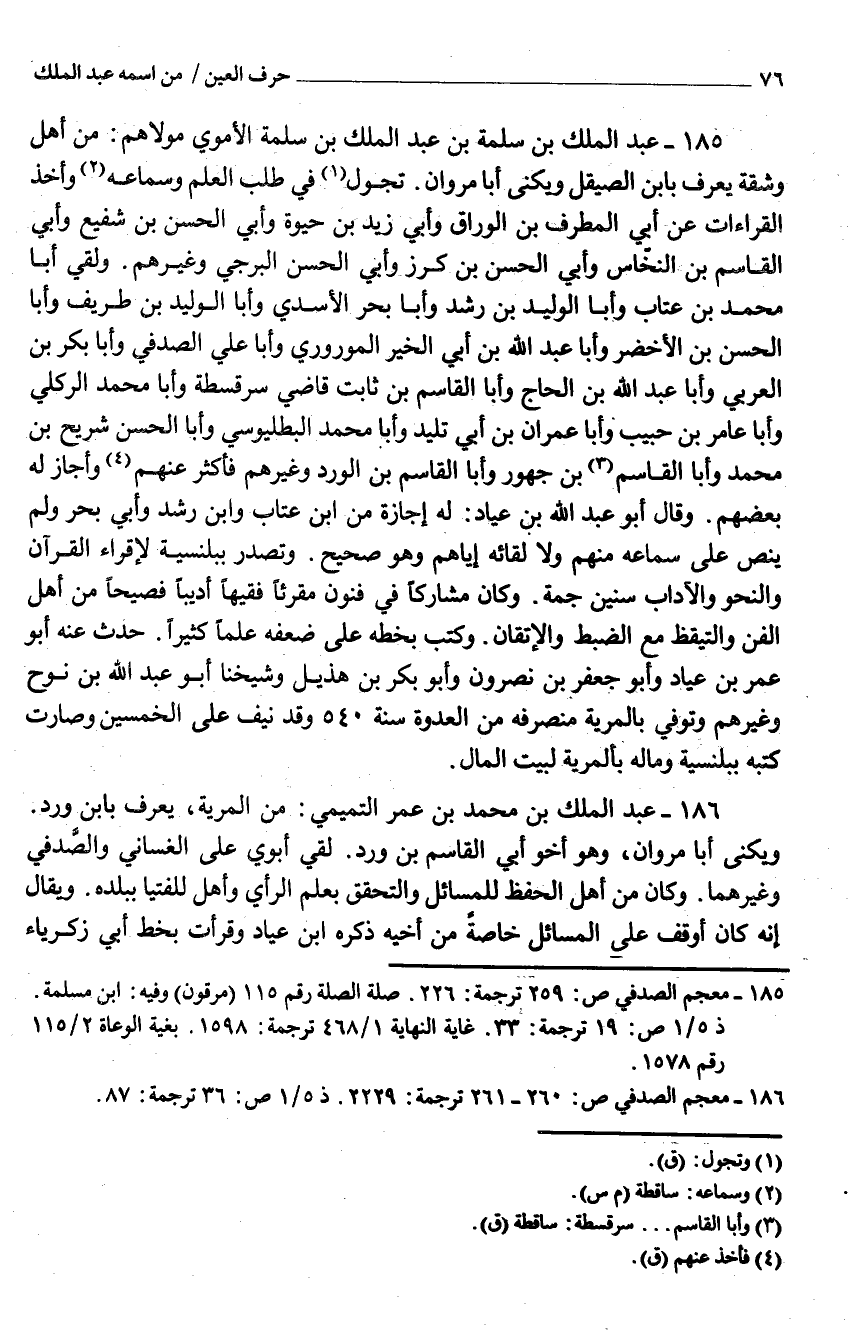 185 - عبد الْملك بن سَلمَة بن عبد الْملك بن سَلمَة الْأمَوِي مَوْلَاهُم من أهل وشقة يعرف بِابْن الصيقل ويكنى أَبَا مَرْوَان تجول فِي طلب الْعلم وسماعه وَأخذ الْقرَاءَات عَن أَبِي الْمطرف بن الْوراق وَأبي زيد بن حَيْوَة وَأبي الْحسن بن شَفِيع وَأبي القَاسِم بْن النخاس وَأبي الْحَسَن بْن كُرْز وَأبي الْحَسَن الْبُرْجِي وَغَيرهم وَلَقي أَبَا مُحَمَّد بن عتاب وَأَبا الْوَلِيد بن رشد وَأَبا بَحر الأسَدِيُ وَأَبا الْوَلِيد بن طريف وَأَبا الْحسن بن الْأَخْضَر وَأَبا عبد الله بْن أبي الْخَيْر الموروري وَأَبا عَلِيّ الصَّدَفِي وَأَبا بَكْر بْن الْعَرَبِيّ وَأَبا عبد الله بن الْحَاج وَأَبا الْقَاسِم بن ثَابت قَاضِي سرقسطة وَأَبا مُحَمَّد الركلي وَأَبا عَامر بْن حبيب وَأَبا عمرَان بن أَبِي تليد وَأَبا مُحَمَّد البطليوسي وَأَبا الْحسن شُرَيْح بن مُحَمَّد وَأَبا الْقَاسِم بن جهور وَأَبا الْقَاسِم بن الْورْد وَغَيرهم فَأكْثر عَنْهُم وَأَجَازَ لَهُ بَعْضهم وَقَالَ أَبُو عبد الله بن عياد لَهُ إجَازَة من ابْن عتاب وَابْن رشد وَأبي بَحر وَلم ينص عَليّ سَمَاعه مِنْهُم وَلَا لِقَائِه إيَّاهُم وَهُوَ صَحِيح وتصدر ببلنسية لإقراء الْقُرْآن والنحو والآداب سِنِين جمة وَكَانَ مشاركا فِي فنون مقرئا فَقِيها أديبا فصيحا من أهل الْفَنّ والتيقظ مَعَ الضَّبْط والإتقان وَكتب بِخَطِّهِ عَليّ ضعفه علما كثيرا حدث عَنهُ أَبُو عمر بن عياد وَأَبُو جَعْفَر بن نصرون وَأَبُو بكر بن هُذَيْل وَشَيخنَا أَبُو عبد الله بن نوح وَغَيرهم وَتُوفِّي بالمرية مُنْصَرفه من العدوة سنة 540 وَقد نَيف عَليّ الْخمسين وَصَارَت كتبه ببلنسية وَمَاله بالمرية لبيت المَال