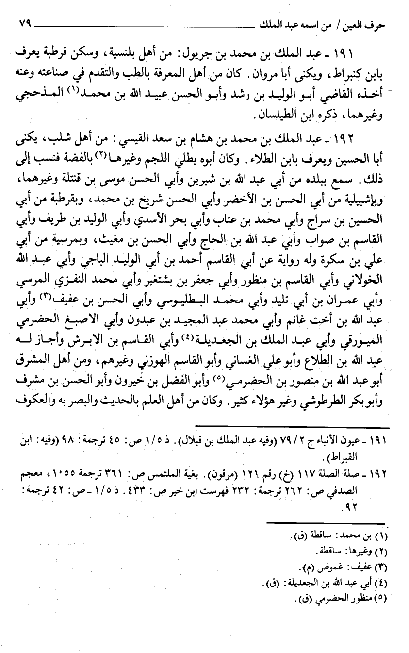 191 - عَبْد الْملك بْن مُحَمَّد بْن جريول من أهل بلنسية وَسكن قرطبة يعرف بِابْن كنبراط ويكنى أَبَا مَرْوَان كَانَ من أهل الْمعرفَة بالطب والتقدم فِي صناعته وَعنهُ أَخذه القَاضِي أَبُو الْوَلِيد بن رشد وَأَبُو الْحسن عبيد الله بن مُحَمَّد الْمذْحِجِي وَغَيرهمَا ذكره ابْن الطيلسان