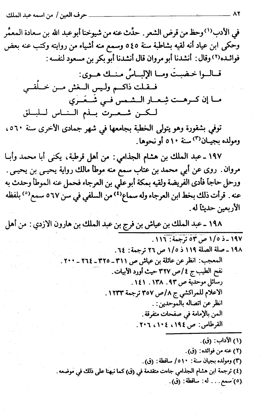 197 - عبد الْملك بن هِشَام الجذامي من أهل قرطبة يكنى أَبَا مُحَمَّد وَأَبا مَرْوَان روى عَنْ أبي مُحَمَّد بْن عتاب سمع مِنْهُ موطأ مَالك رِوَايَة يحيى بن يحيى ورحل حَاجا فأدي الْفَرِيضَة ولقيه بِمَكَّة أَبُو عَليّ بن العرجاء فَحمل عَنهُ الْمُوَطَّأ وَحدث بِهِ عَنهُ قَرَأت ذَلِك بِخَط ابْن العرجاء وَله سَماع من السلَفِي فِي سنّ 567 سمع بِلَفْظِهِ الْأَرْبَعين حَدِيثا لَهُ