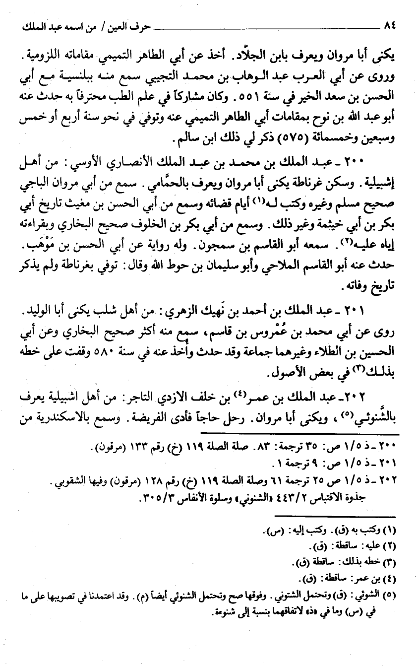 202 - عبد الْملك بن عمر بن خلف الْأَزْدِيّ التَّاجِر من أهل إشبيلية يعرف بالشنوئي ويكنى أَبَا مَرْوَان رَحل حَاجا فَأدى الْفَرِيضَة وَسمع بالإسكندرية من