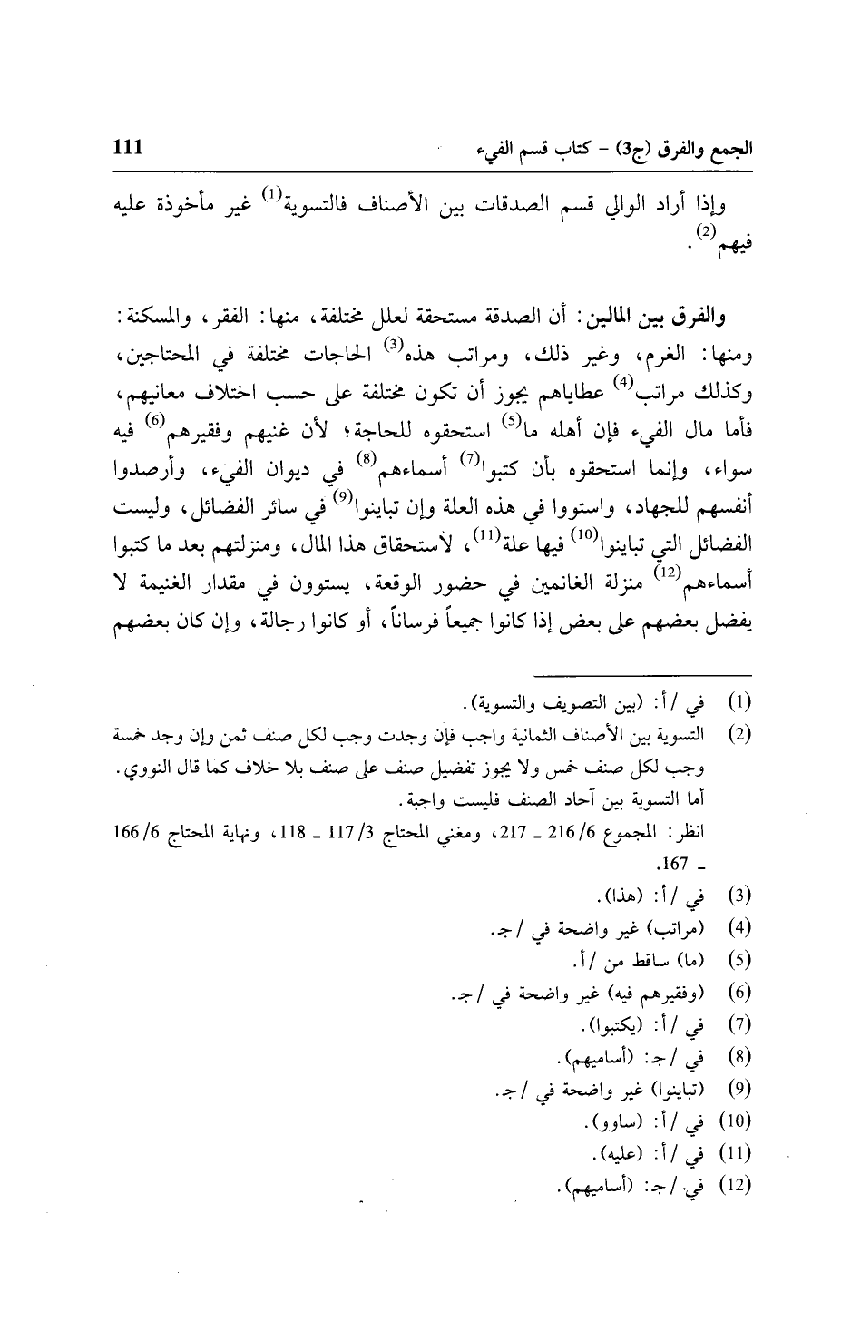 والفرق بين المالين: أن الصدقة مستحقة لعلل مختلفة، منها: الفقر، والمسكنة: ومنها: الغرم وغير ذلك، ومراتب هذه الحاجات مختلفة في المحتاجين، وكذلك مراتب عطاياهم يجوز أن تكون مختلفة على حسب اختلاف معانيهم، فأما مال الفيء فإن أهله ما استحقوه للحاجة؛ لأن غنيهم وفقيرهم فيه سواء، وإنما استحقوه بأن كتبوا أسماءهم في ديوان الفيء، وأرصدوا أنفسهم للجهاد، واستووا في هذه العلة وإن تباينوا في سائر الفضائل، وليست الفضائل التي تباينوا فيها علة، لاستحقاق هذا المال، ومنزلتهم بعد ما كتبوا أسماءهم منزلة الغانمين في حضور الوقعة، يستوون في مقدار الغنيمة لا يفضل بعضهم على بعض إذا كانوا جميعًا فرسانًا، أو كانوا رجالة، وإن كان بعضهم يفضل بعضهم على بعض إذا كانوا جميعًا فرسانًا، أو كانوا رجالة، وإن كان بعضهم