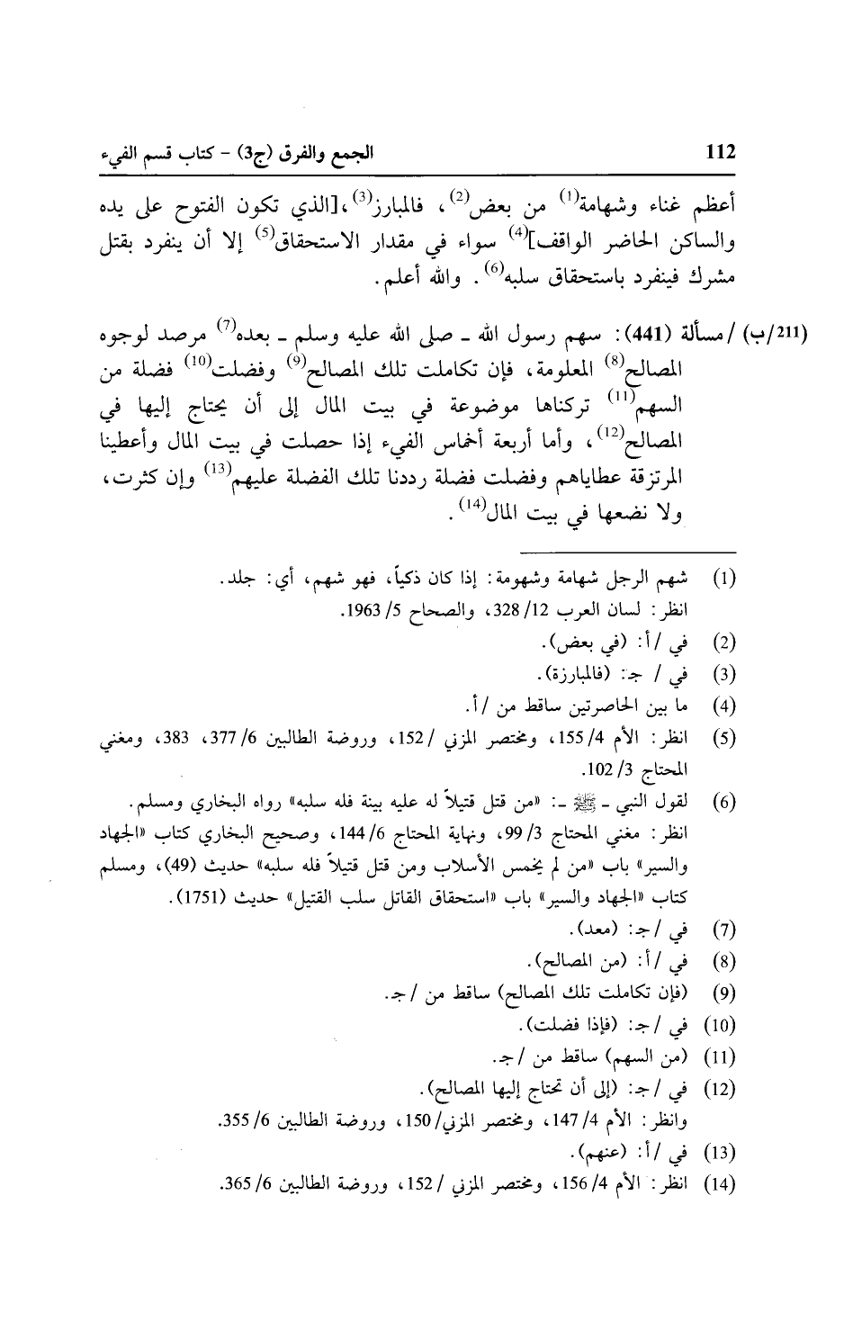 (٢١١/ب) مسألة (٤٤١): سهم رسول الله - صلى الله عليه وسلم - بعده مرصد لوجوه المصالح المعلومة، فإن تكاملت تلك المصالح وفضلت فضلة من السهم تركناها موضوعة في بيت المال إلى أن يحتاج إليها في المصالح، وأما أربعة أخماس الفيء إذا حصلت في بيت المال وأعطينا المرتزقة عطاياهم وفضلت فضلة رددنا تلك الفضلة عليهم، وإن كثرت، ولا نضعها في بيت المال.