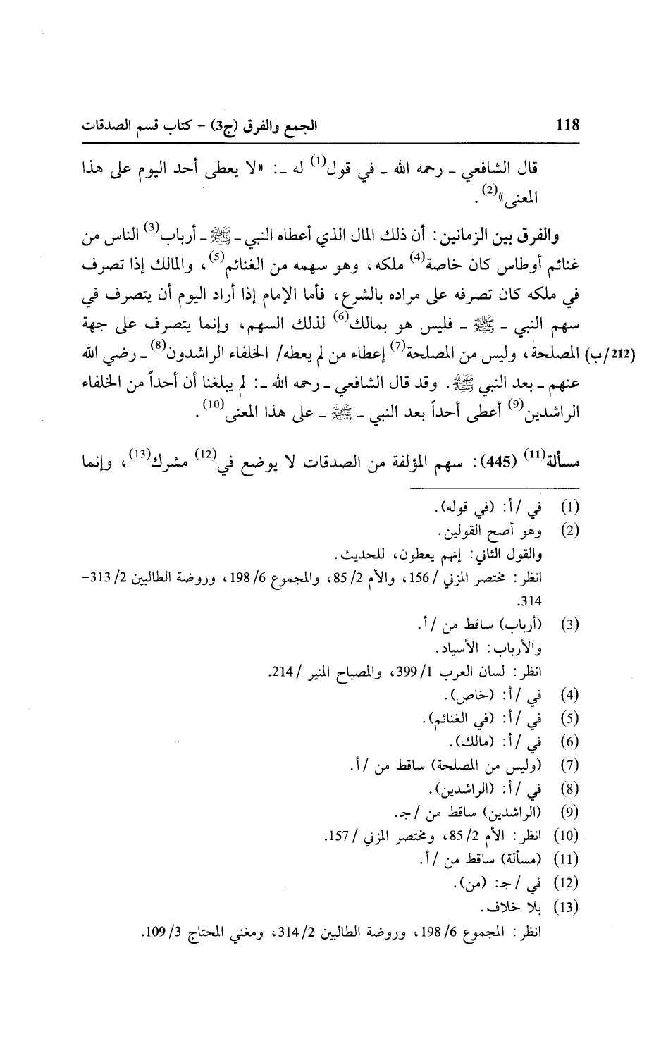 والفرق بين الزمانين: أن ذلك المال الذي أعطاه النبي - صلى الله عليه وسلم - أرباب الناس من غنائم أوطاس كان خاصة ملكه، وهو سهمه من الغنائم، والمالك إذا تصرف في ملكه كان تصرفه على مراده بالشرع، فأما الإمام إذا أراد اليوم أن يتصرف في سهم النبي - صلى الله عليه وسلم - فليس هو بمالك لذلك السهم، وإنما يتصرف على جهة المصلحة، وليس من المصلحة إعطاء من لم يعطه/ (٢١٢/ ب) الخلفاء الراشدون - رضي الله عنهم - بعد النبي صلى الله عليه وسلم. وقد قال الشافعي - رحمه الله: لم يبلغنا أن أحدًا من الخلفاء الراشدين أعطى أحدًا بعد النبي - صلى الله عليه وسلم - على هذا المعنى.