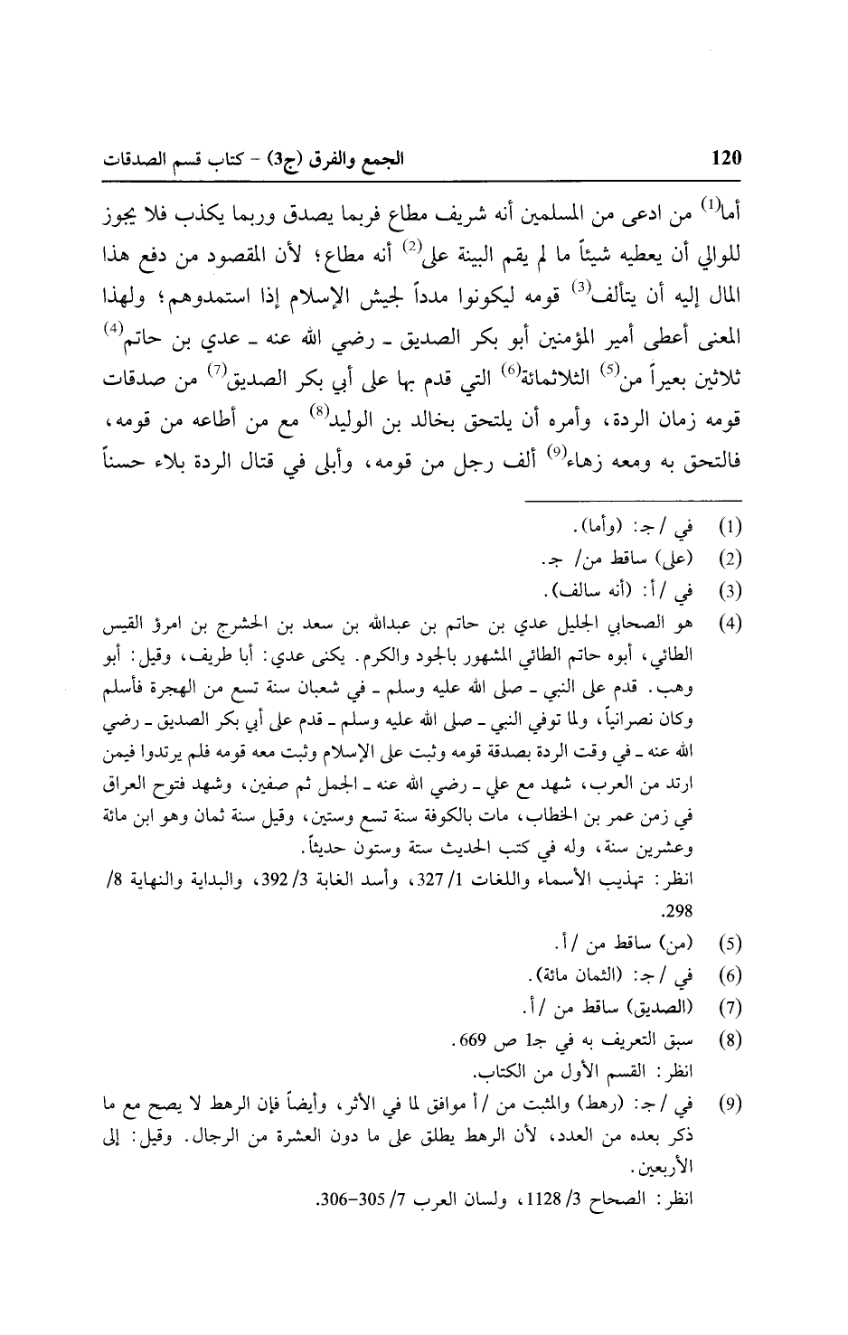 أما من ادعى من المسلمين أنه شريف مطاع فربما يصدق وربما يكذب فلا يجوز للوالي أن يعطيه شيئًا ما لم يقم البينة على أنه مطاع؛ لأن المقصود من دفع هذا المال إليه أن يتألف قومه ليكونوا مددًا لجيش الإسلام إذا استمدوهم؛ ولهذا المعنى أعطى أمير المؤمنين أبو بكر الصديق - رضي الله عنه - عدي بن حاتم ثلاثين بعيرًا من الثلاثمائة التي قدم بها على أبي بكر الصديق من صدقات قومه زمان الردة، وأمره أن يلتحق بخالد بن الوليد مع من أطاعه من قومه، فالتحق به ومعه زهاء ألف رجل من قومه، وأبلى في قتال الردة بلاء حسنًا