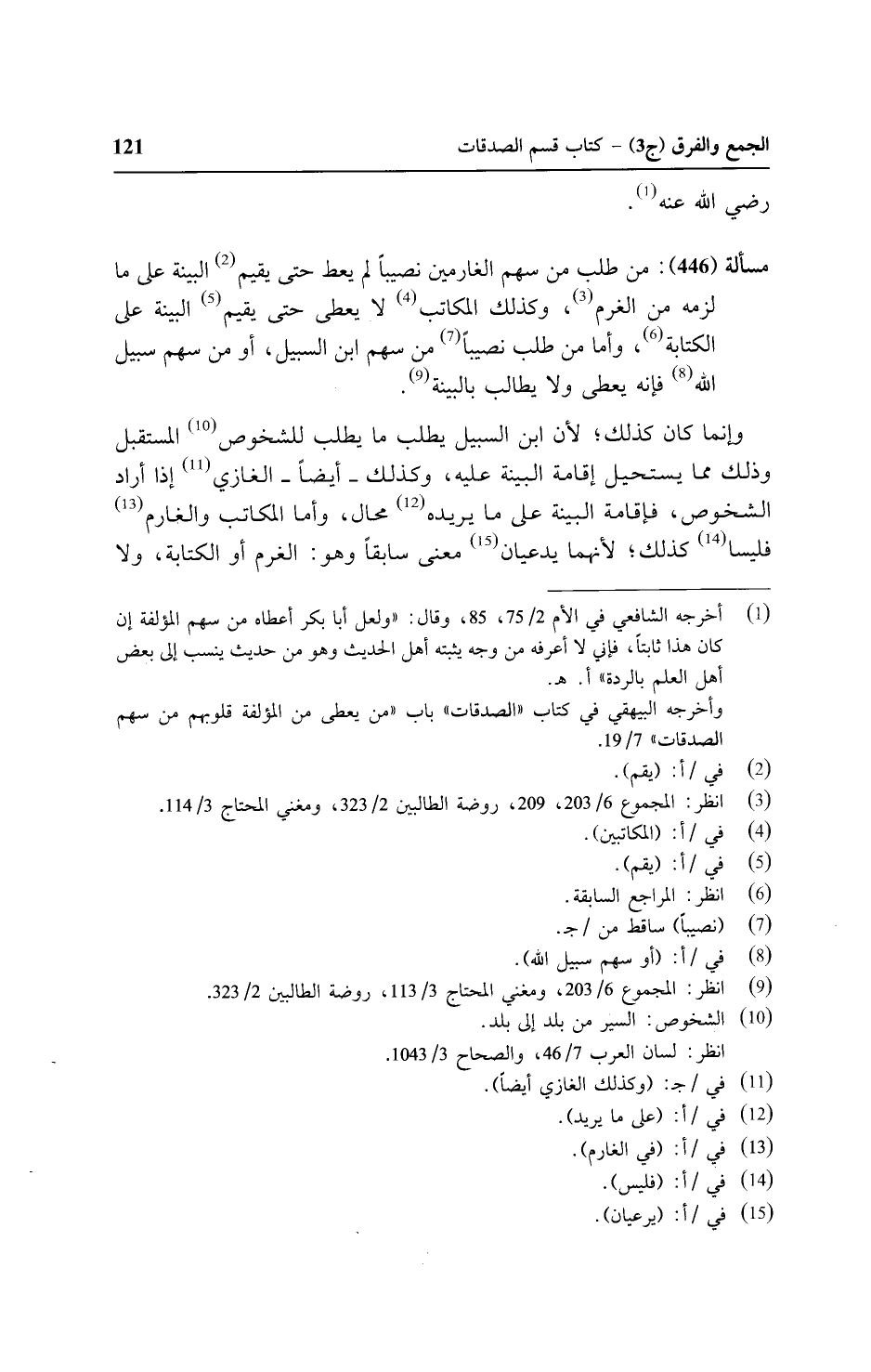 مسألة (٤٤٦): من طلب من سهم الغارمين نصيبًا لم يعط حتى يقيم البينة على ما لزمه من الغرم، وكذلك المكاتب لا يعطي حتى يقيم البينة على الكتابة، وأما من طلب نصيبًا من سهم ابن السبيل، أو من سهم سبيل الله فإنه يعطى ولا يطالب بالبينة.